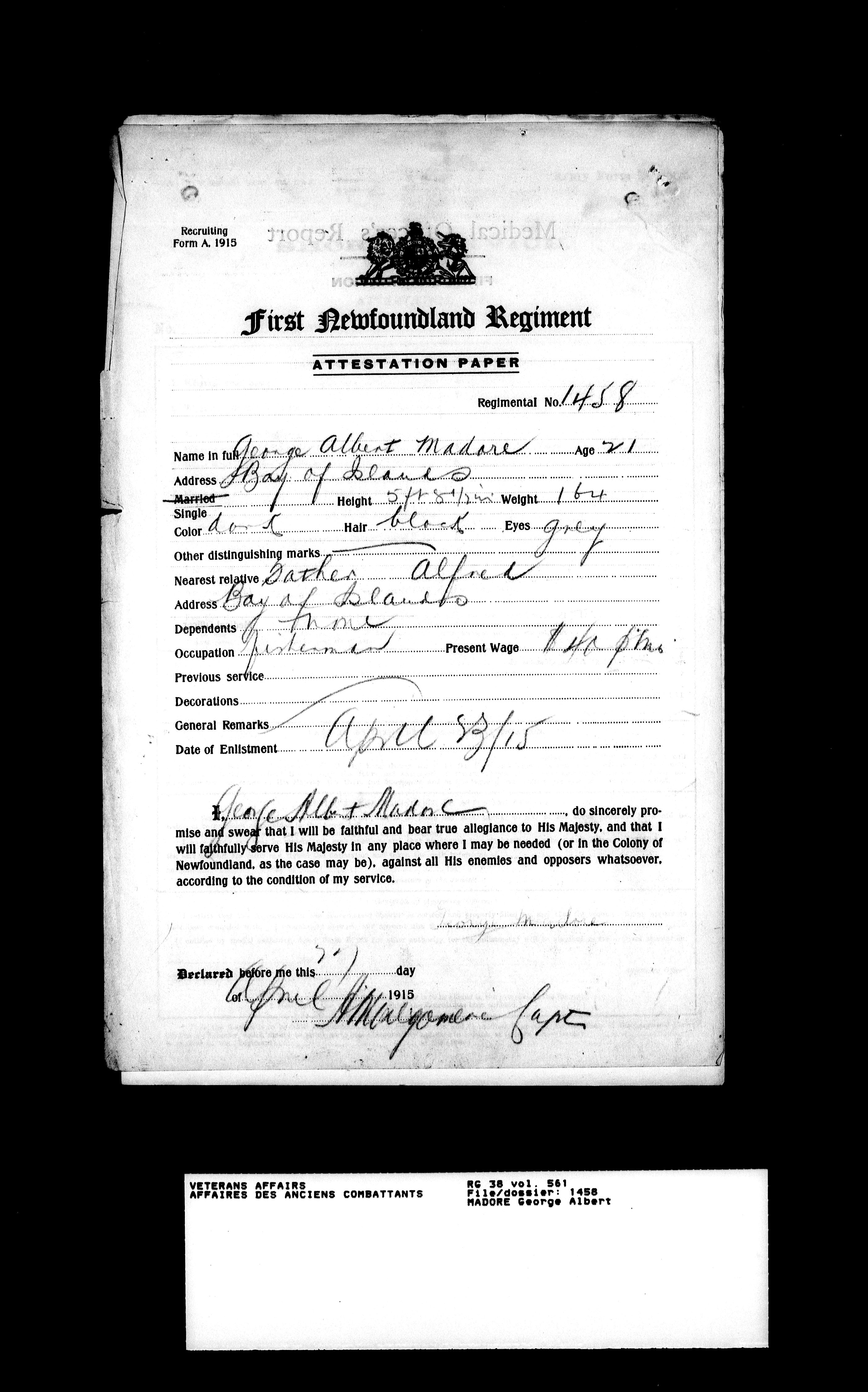 Royal Newfoundland Regiment service files : T-18100