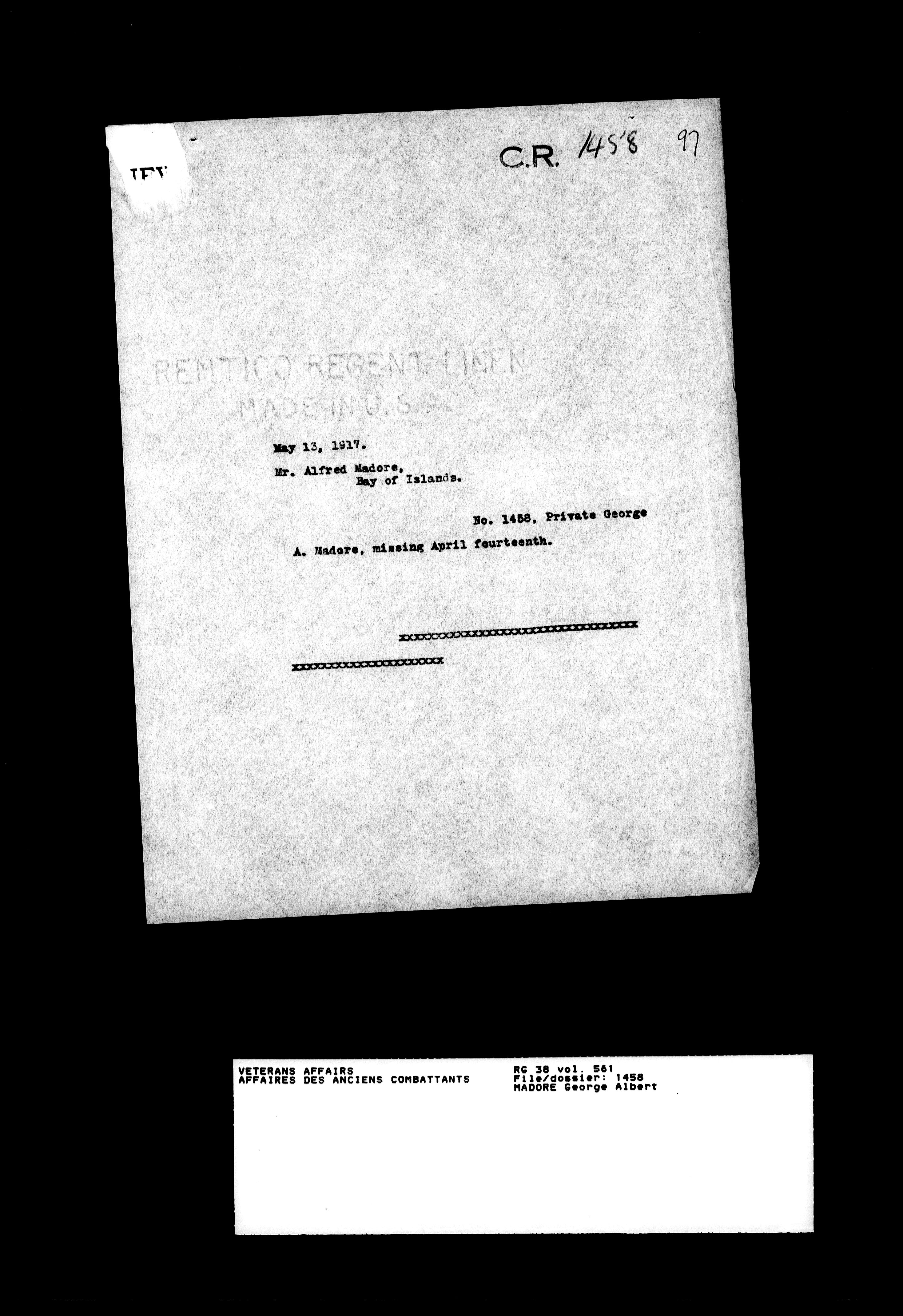 Royal Newfoundland Regiment service files : T-18100