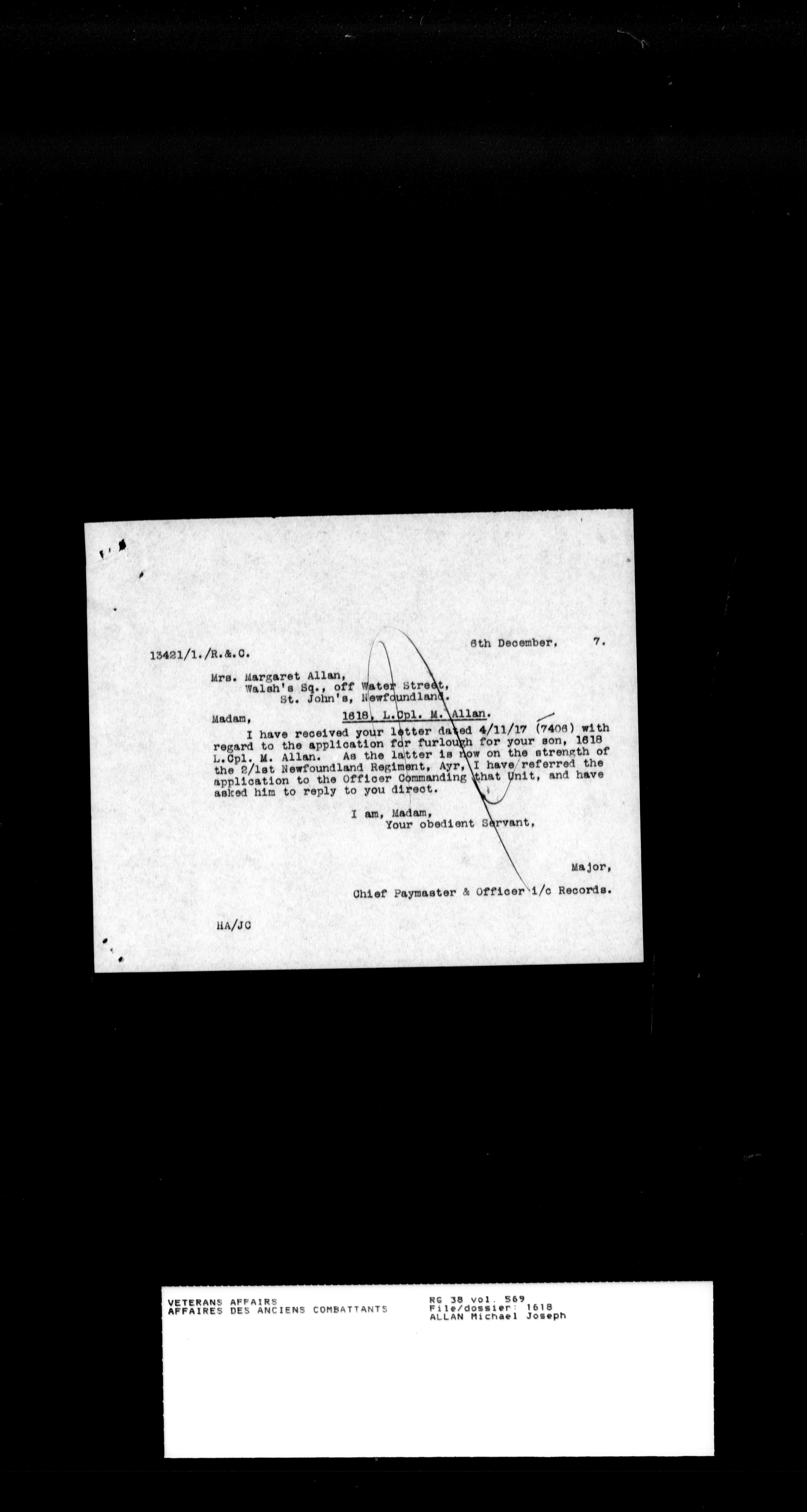 Military service files for members of the Royal Newfoundland Regiment and bandsmen and the Newfoundland Forestry Corps (1914-1919) - 18109