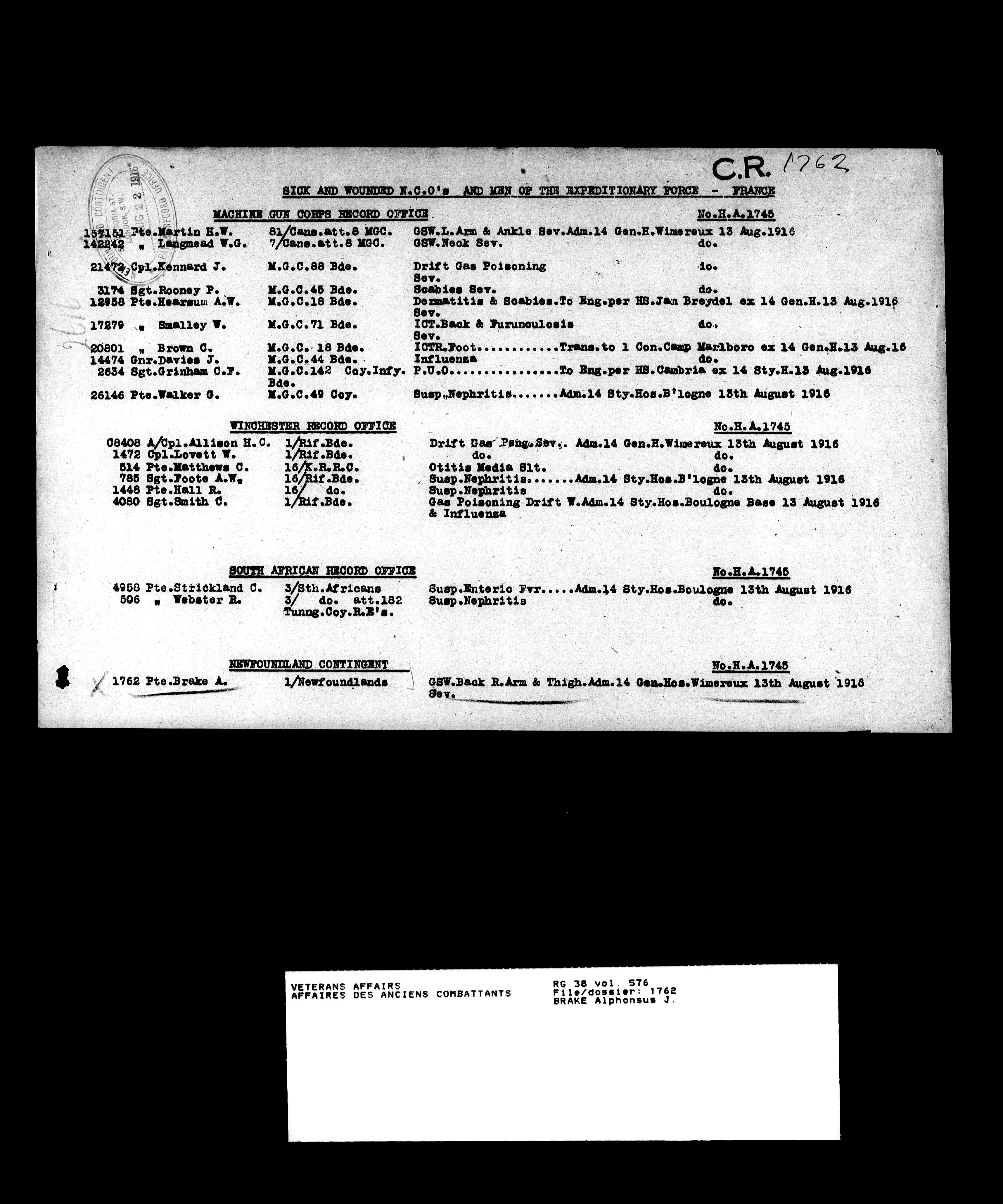 Military service files for members of the Royal Newfoundland Regiment and bandsmen and the Newfoundland Forestry Corps (1914-1919) - 18116