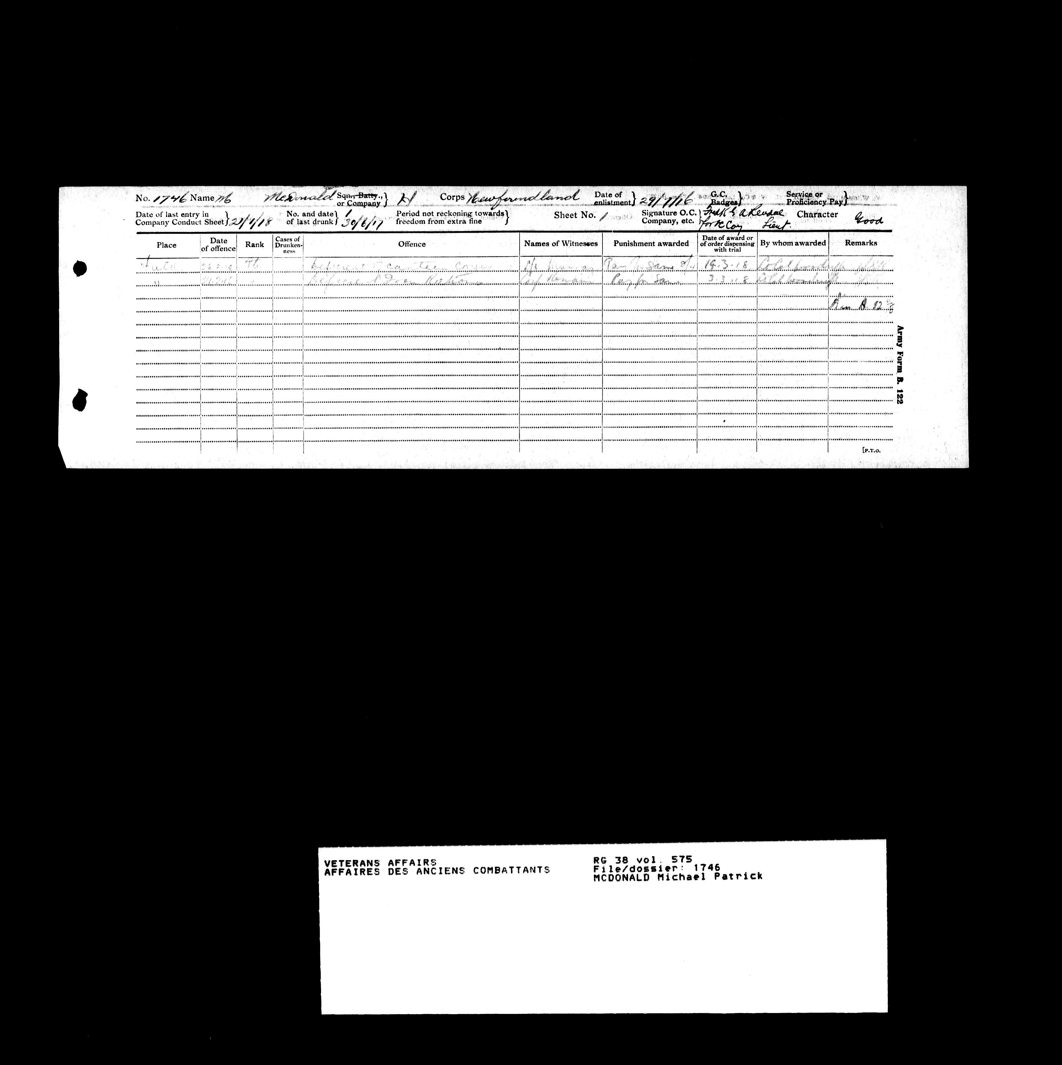 Military service files for members of the Royal Newfoundland Regiment and bandsmen and the Newfoundland Forestry Corps (1914-1919) - 18116