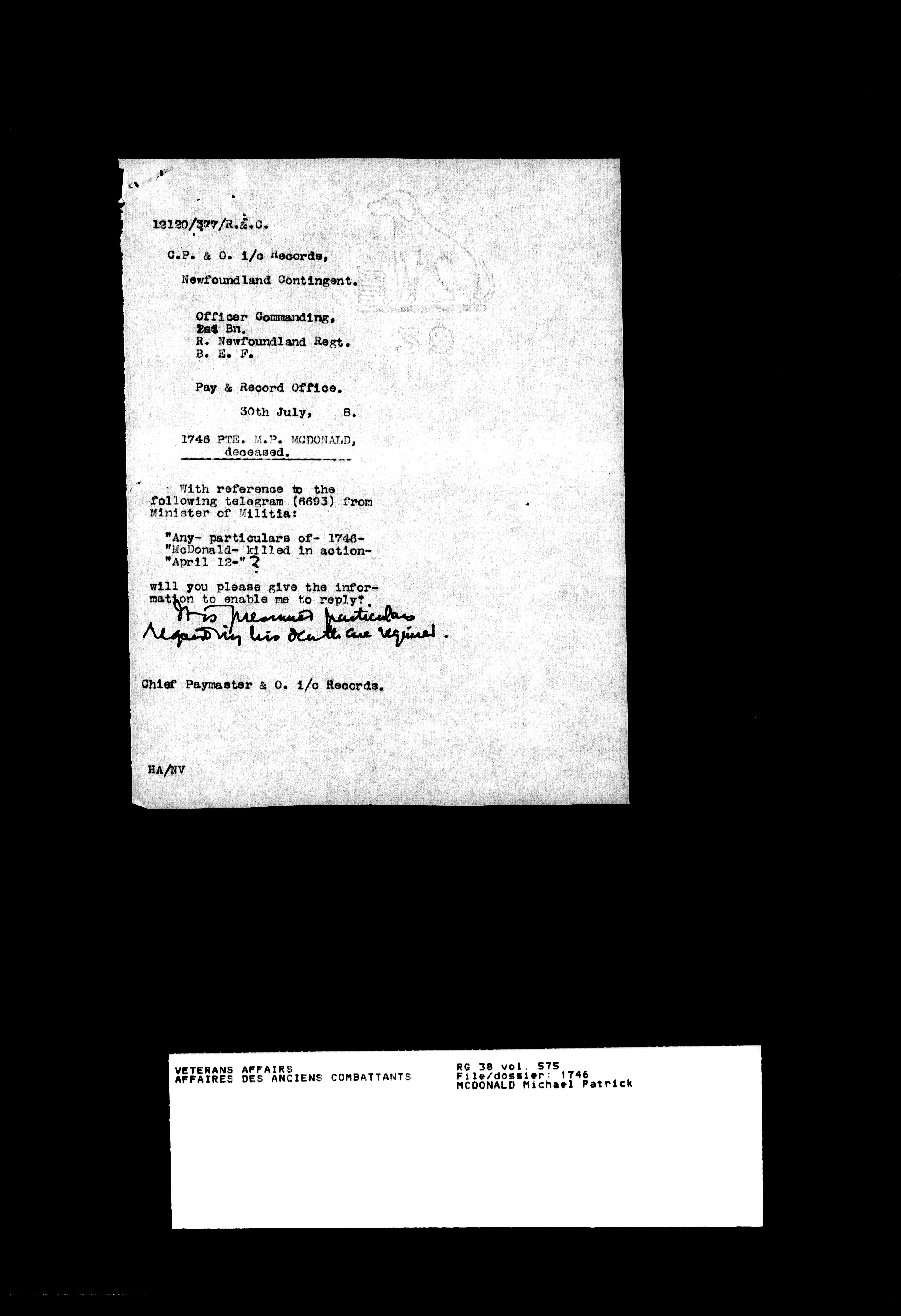 Military service files for members of the Royal Newfoundland Regiment and bandsmen and the Newfoundland Forestry Corps (1914-1919) - 18116