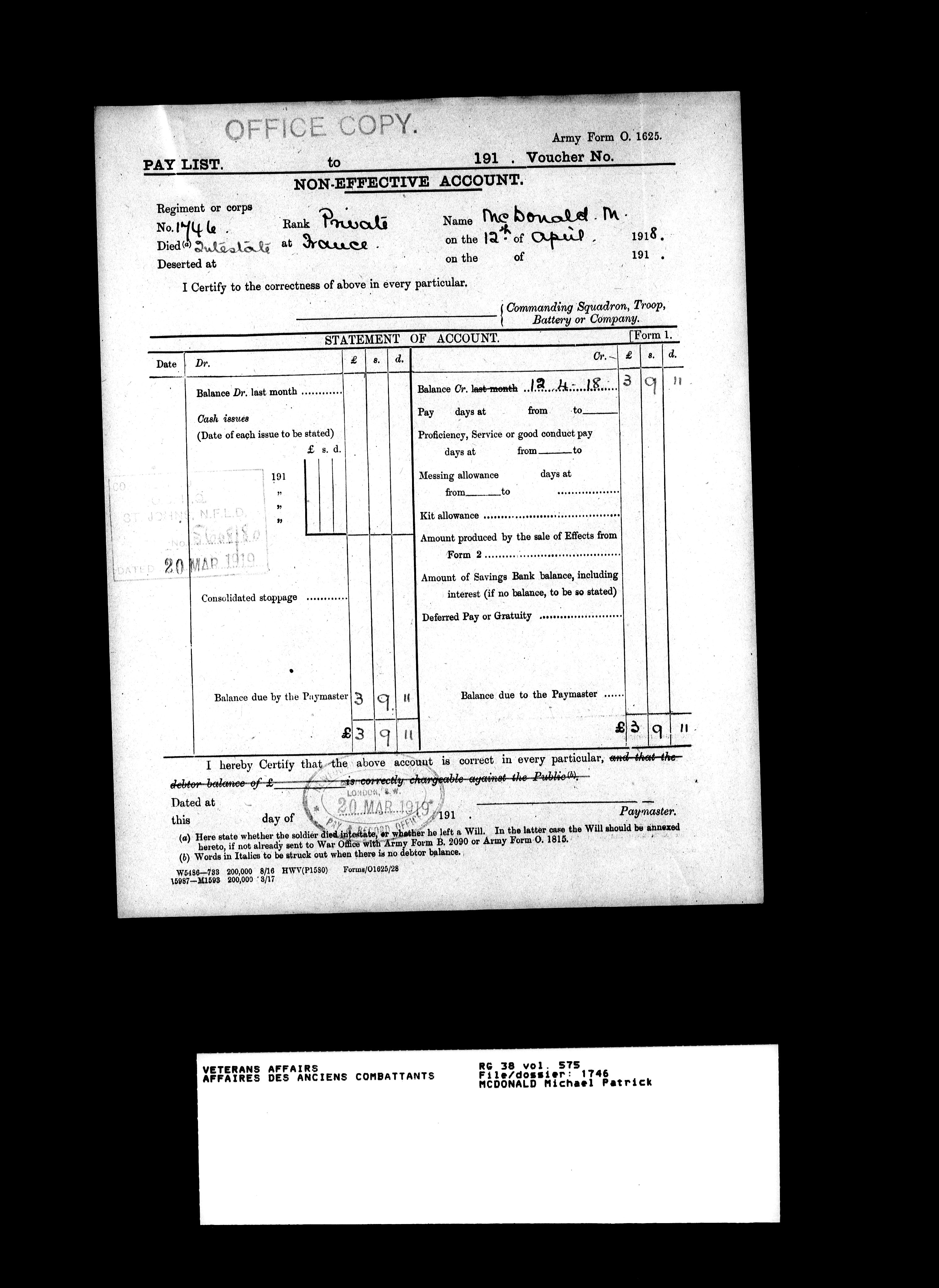Military service files for members of the Royal Newfoundland Regiment and bandsmen and the Newfoundland Forestry Corps (1914-1919) - 18116