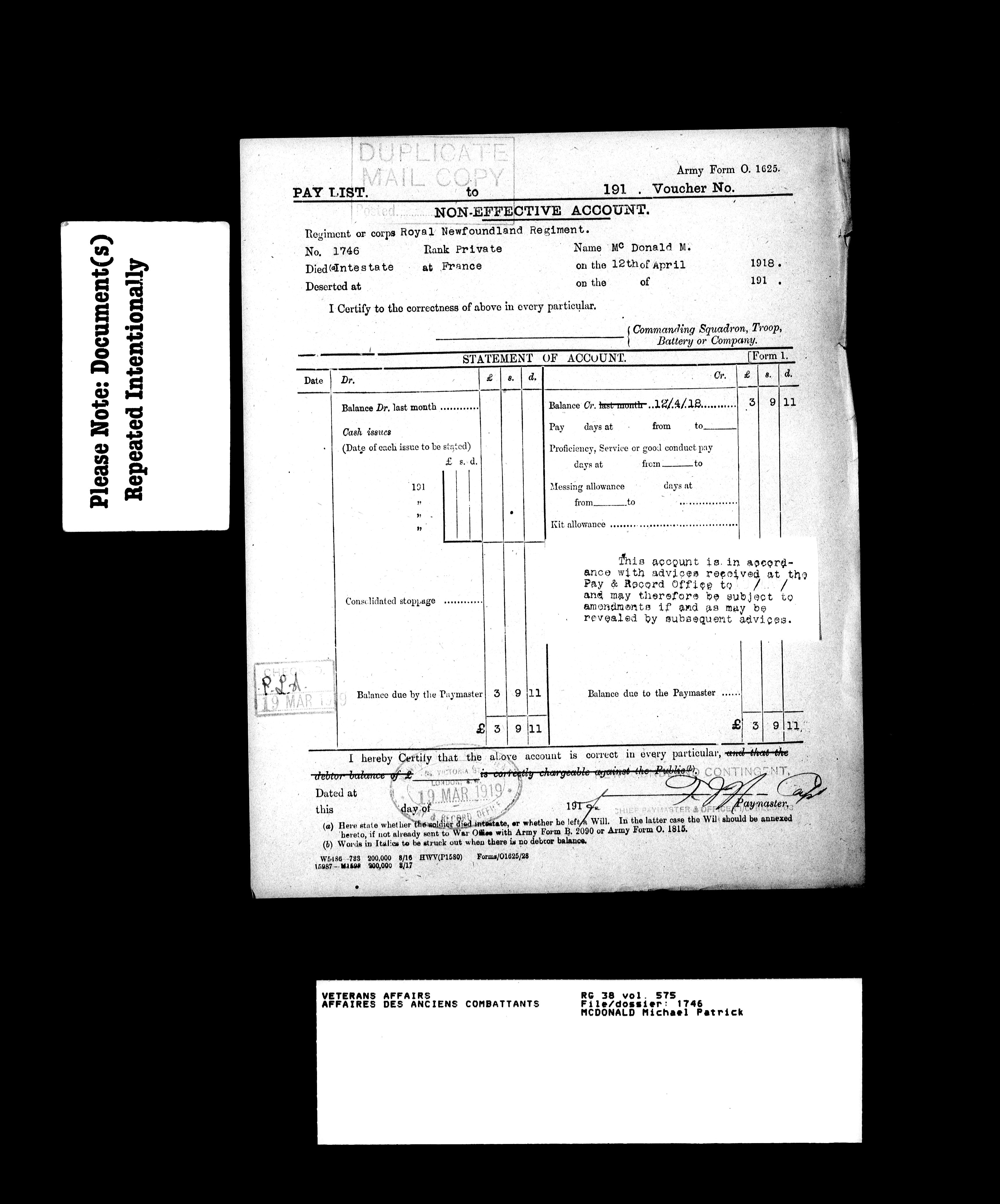 Military service files for members of the Royal Newfoundland Regiment and bandsmen and the Newfoundland Forestry Corps (1914-1919) - 18116
