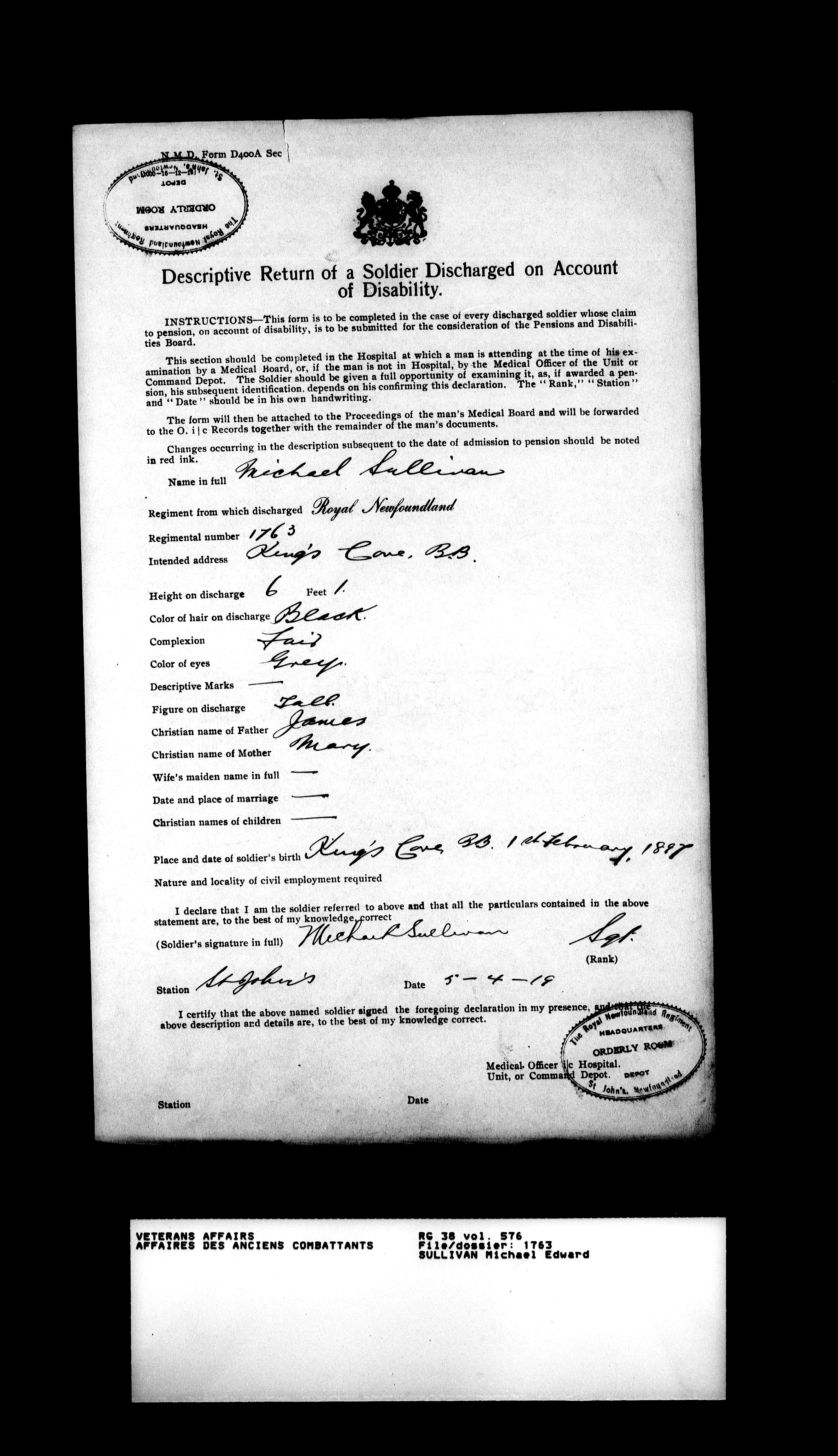Military service files for members of the Royal Newfoundland Regiment and bandsmen and the Newfoundland Forestry Corps (1914-1919) - 18117