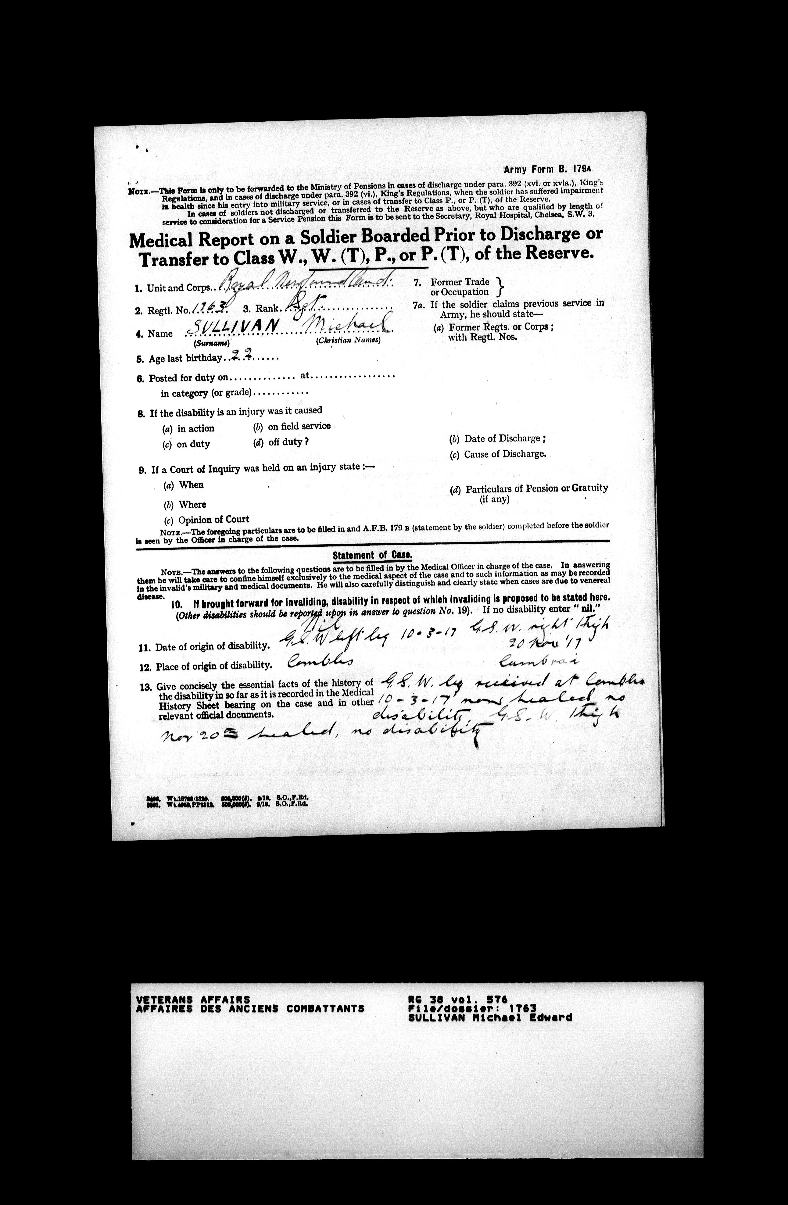 Military service files for members of the Royal Newfoundland Regiment and bandsmen and the Newfoundland Forestry Corps (1914-1919) - 18117