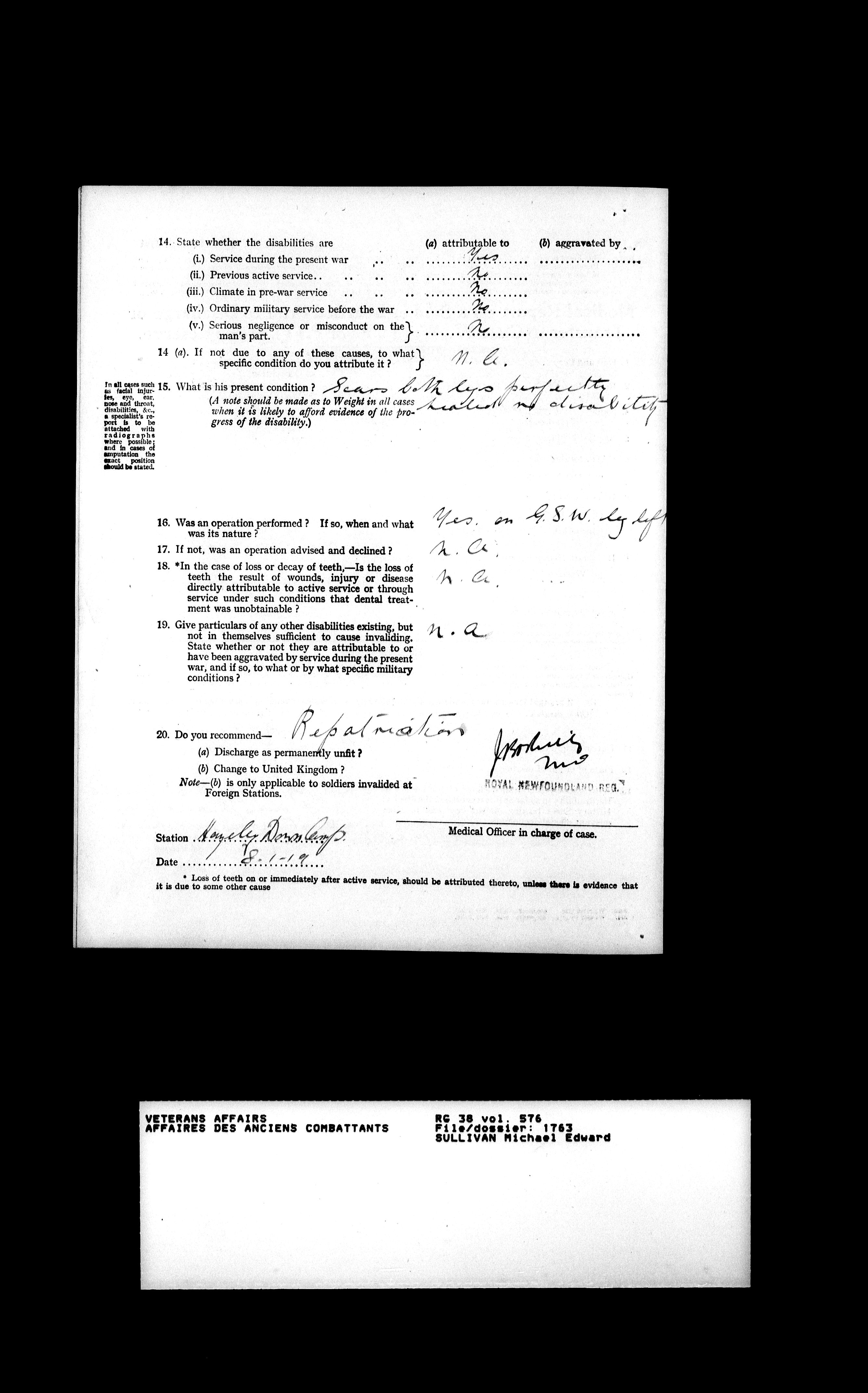 Military service files for members of the Royal Newfoundland Regiment and bandsmen and the Newfoundland Forestry Corps (1914-1919) - 18117