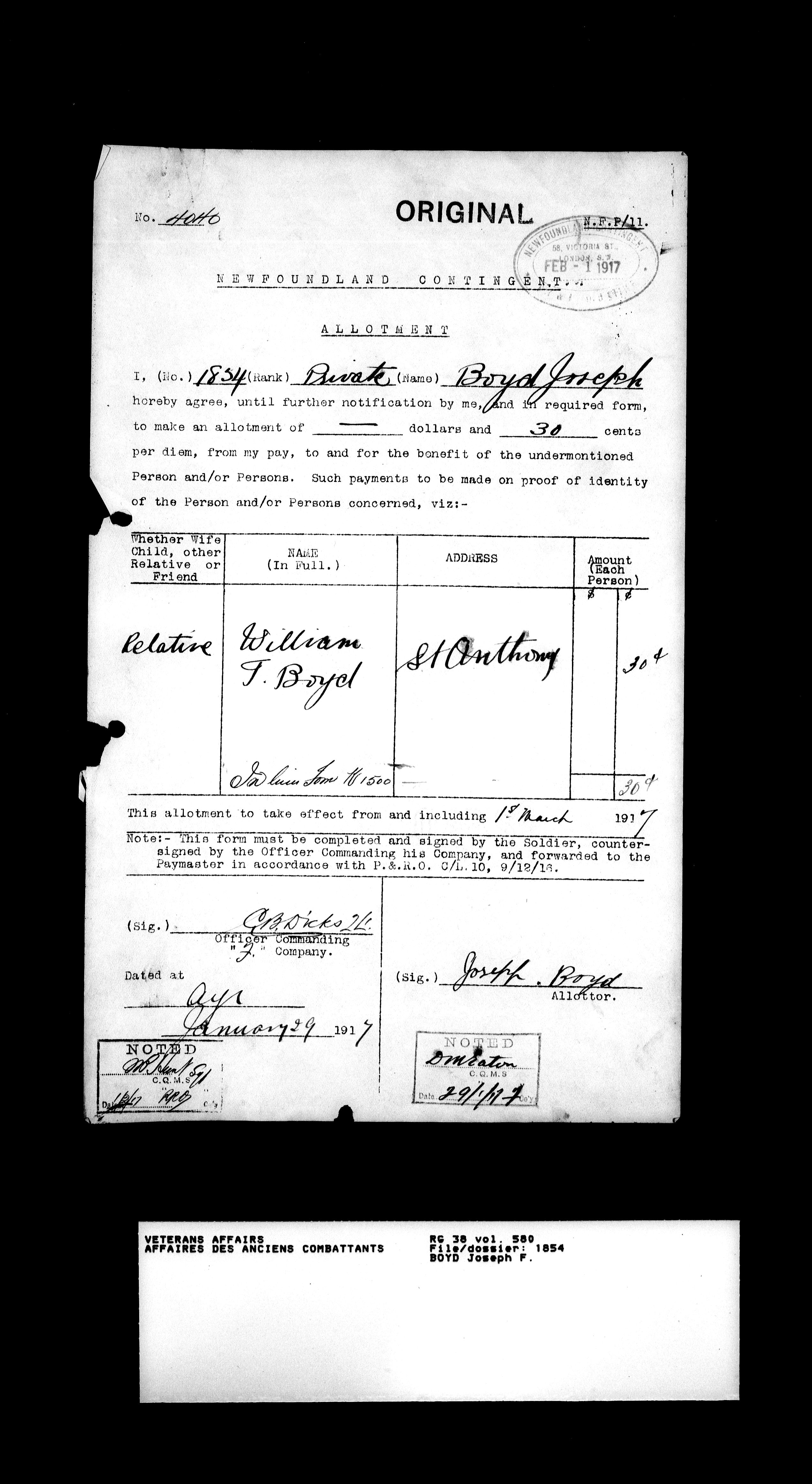 Military service files for members of the Royal Newfoundland Regiment and bandsmen and the Newfoundland Forestry Corps (1914-1919) - 18122