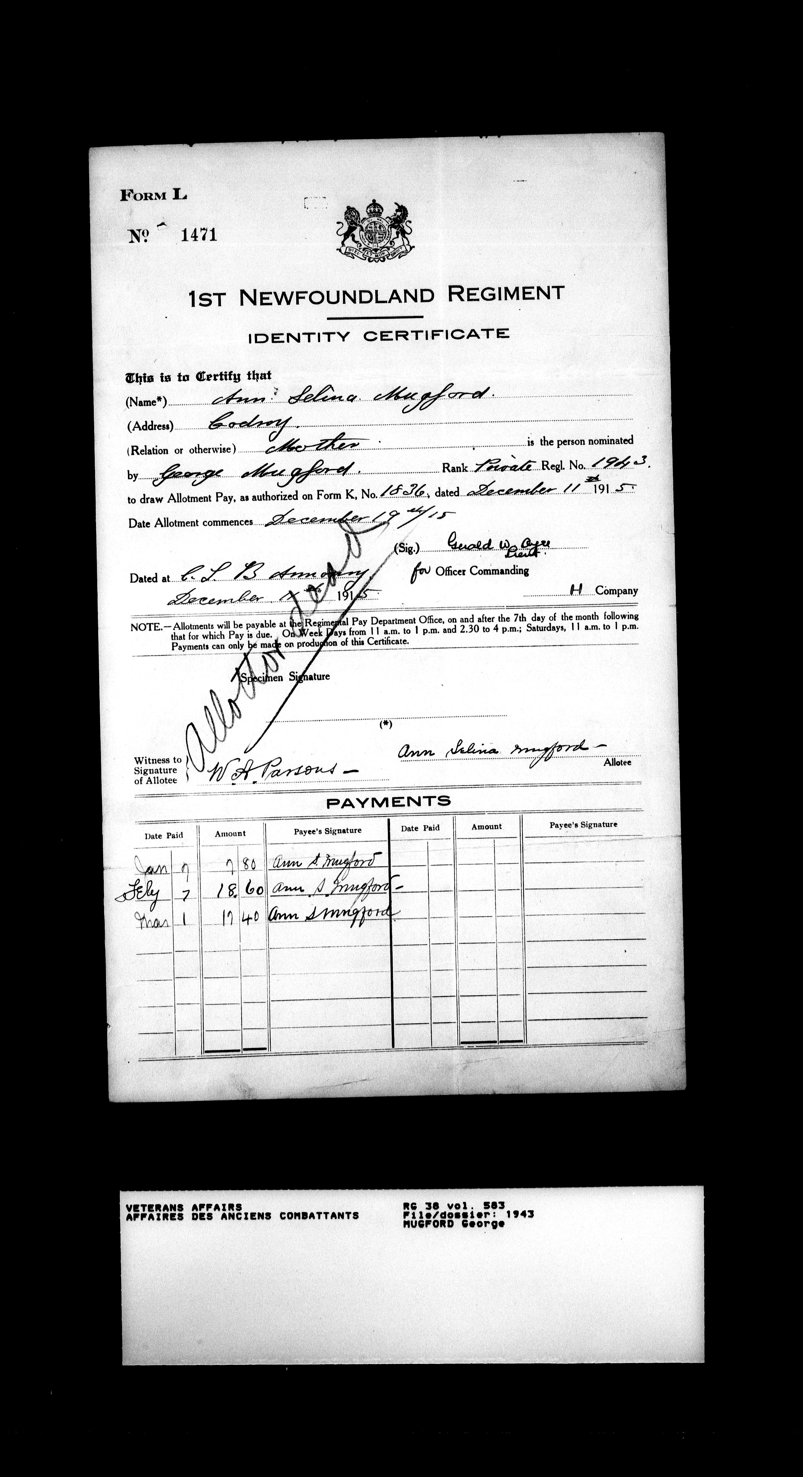 Military service files for members of the Royal Newfoundland Regiment and bandsmen and the Newfoundland Forestry Corps (1914-1919) - 18126