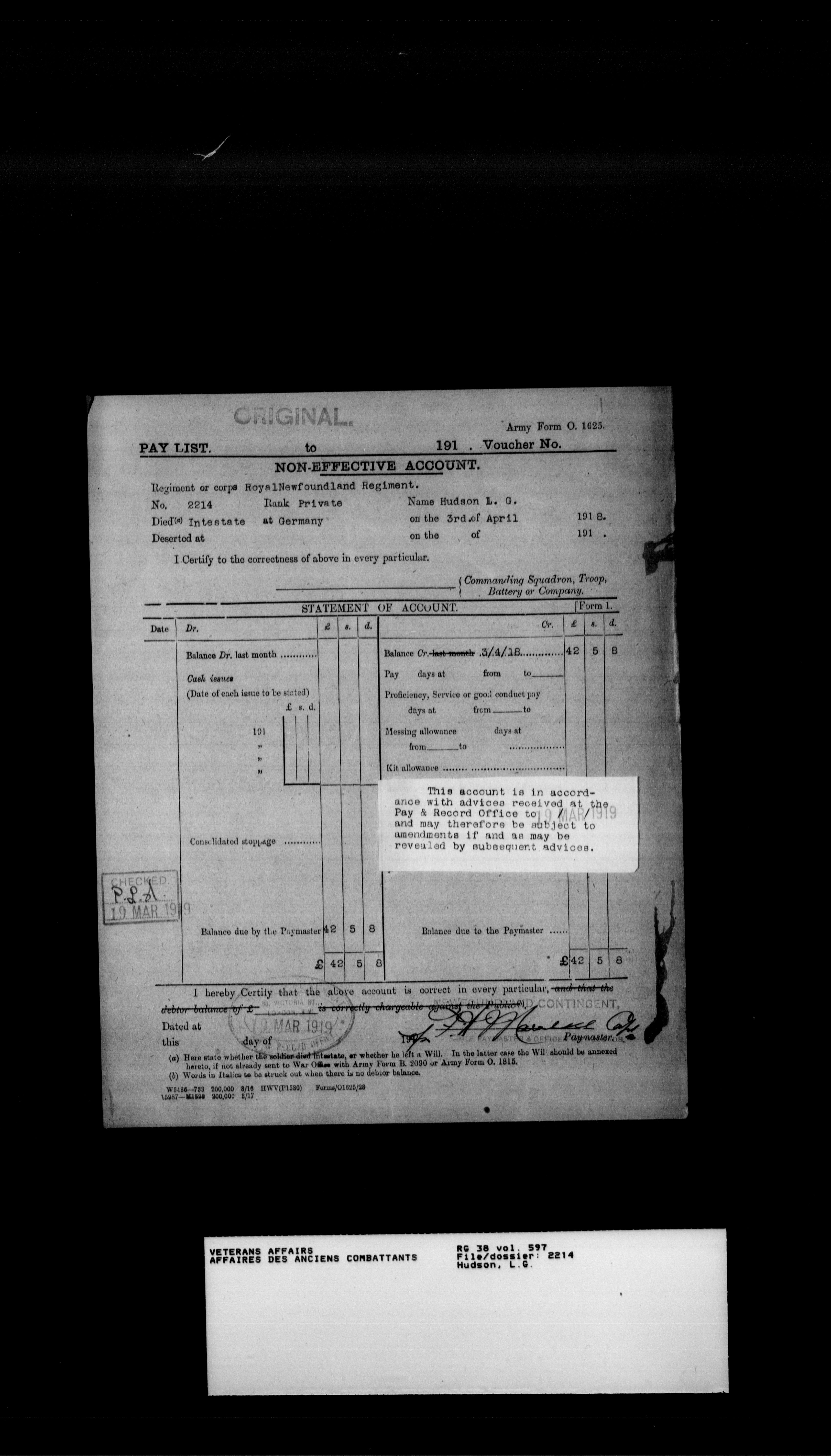 Military service files for members of the Royal Newfoundland Regiment and bandsmen and the Newfoundland Forestry Corps (1914-1919) - 18142