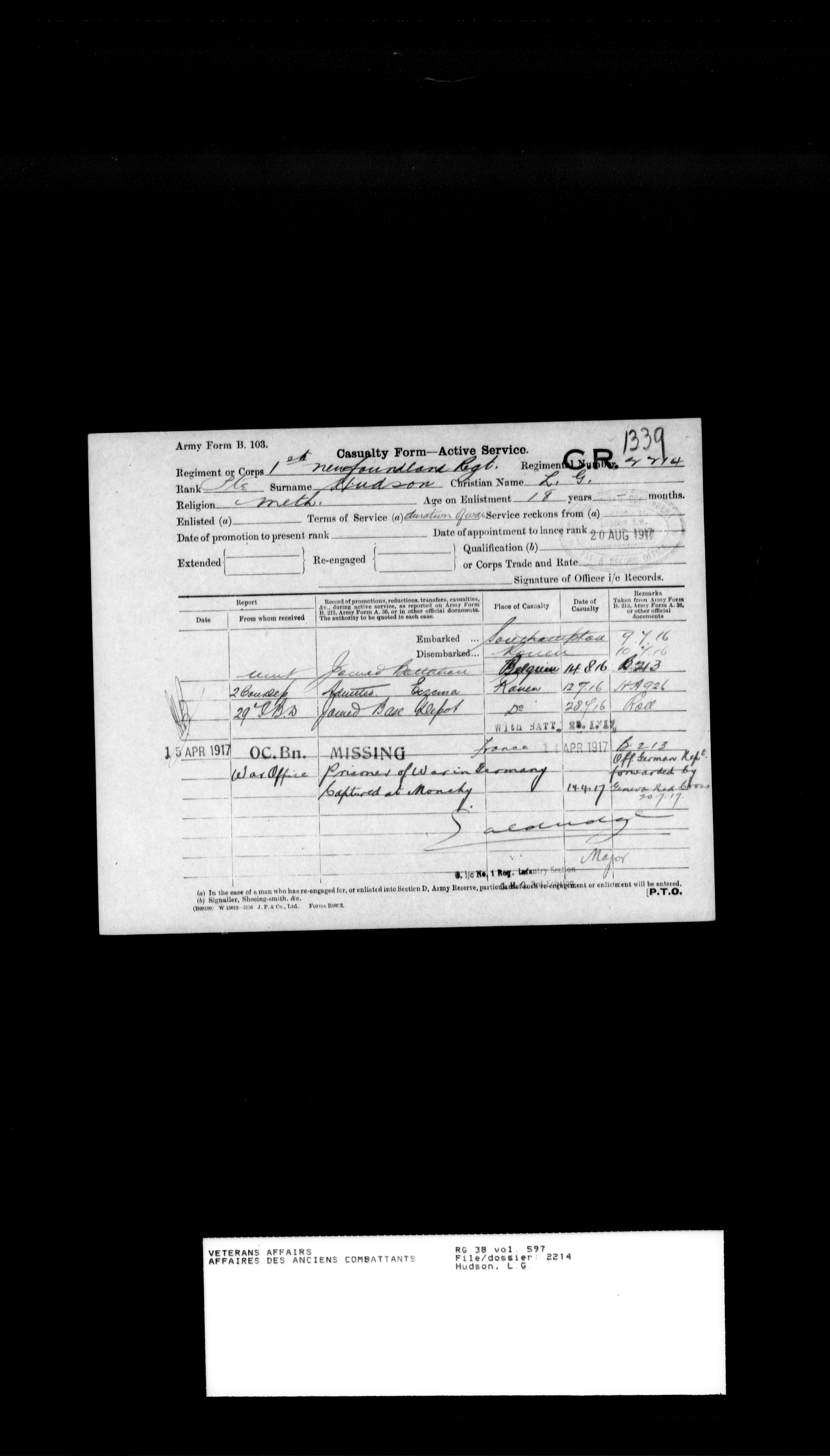 Military service files for members of the Royal Newfoundland Regiment and bandsmen and the Newfoundland Forestry Corps (1914-1919) - 18142