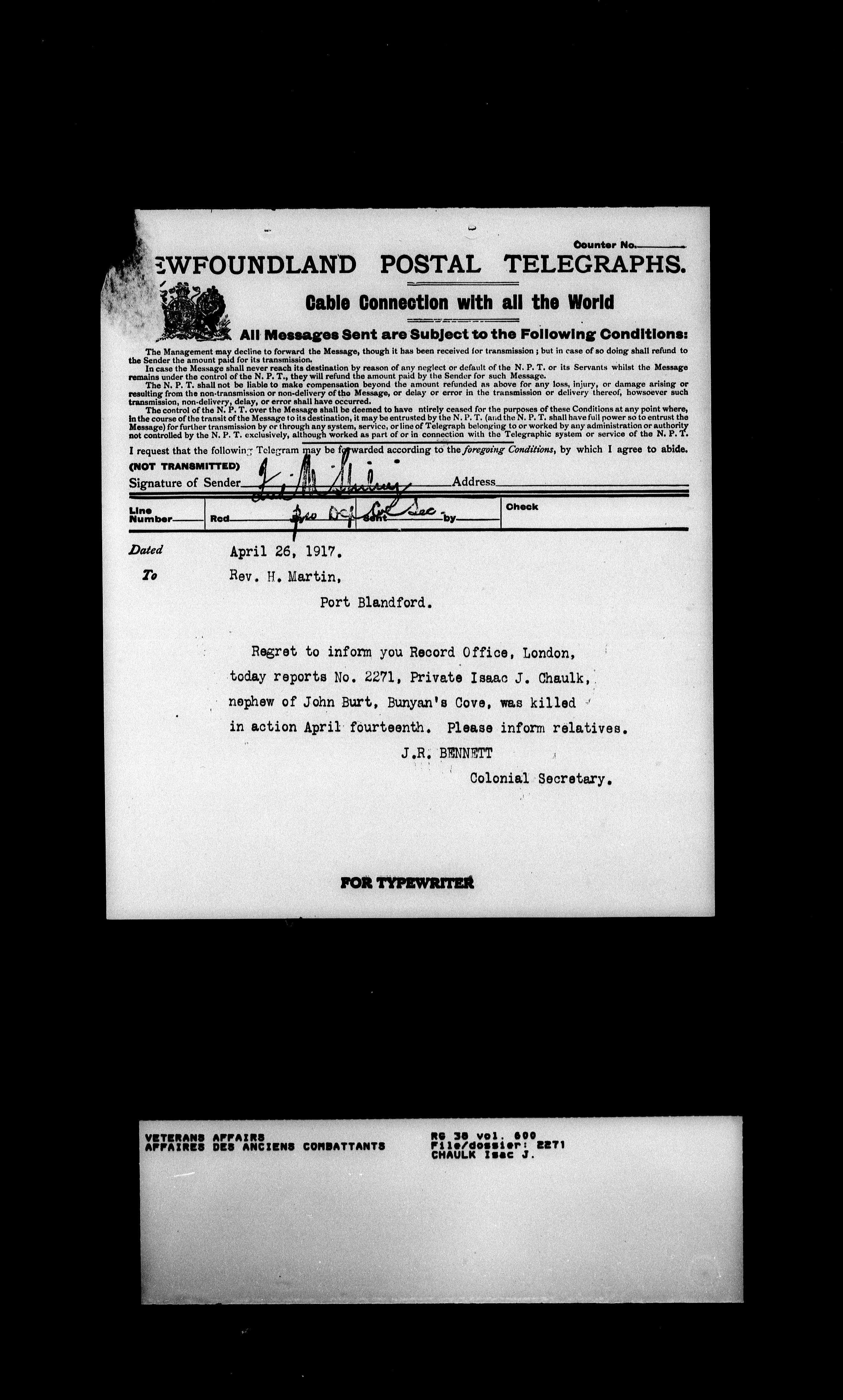 Military service files for members of the Royal Newfoundland Regiment and bandsmen and the Newfoundland Forestry Corps (1914-1919) - 18145