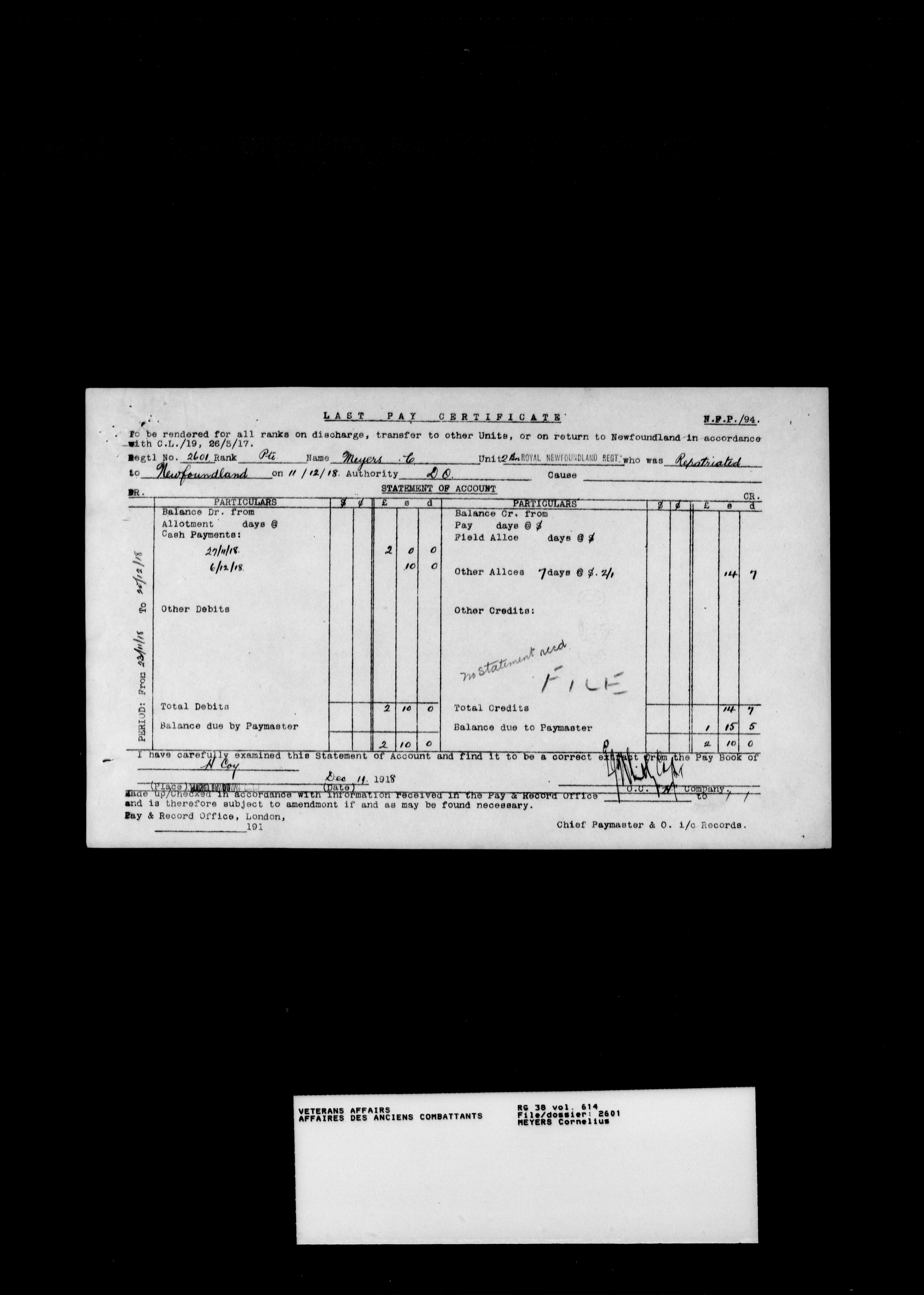 Military service files for members of the Royal Newfoundland Regiment and bandsmen and the Newfoundland Forestry Corps (1914-1919) - 18160