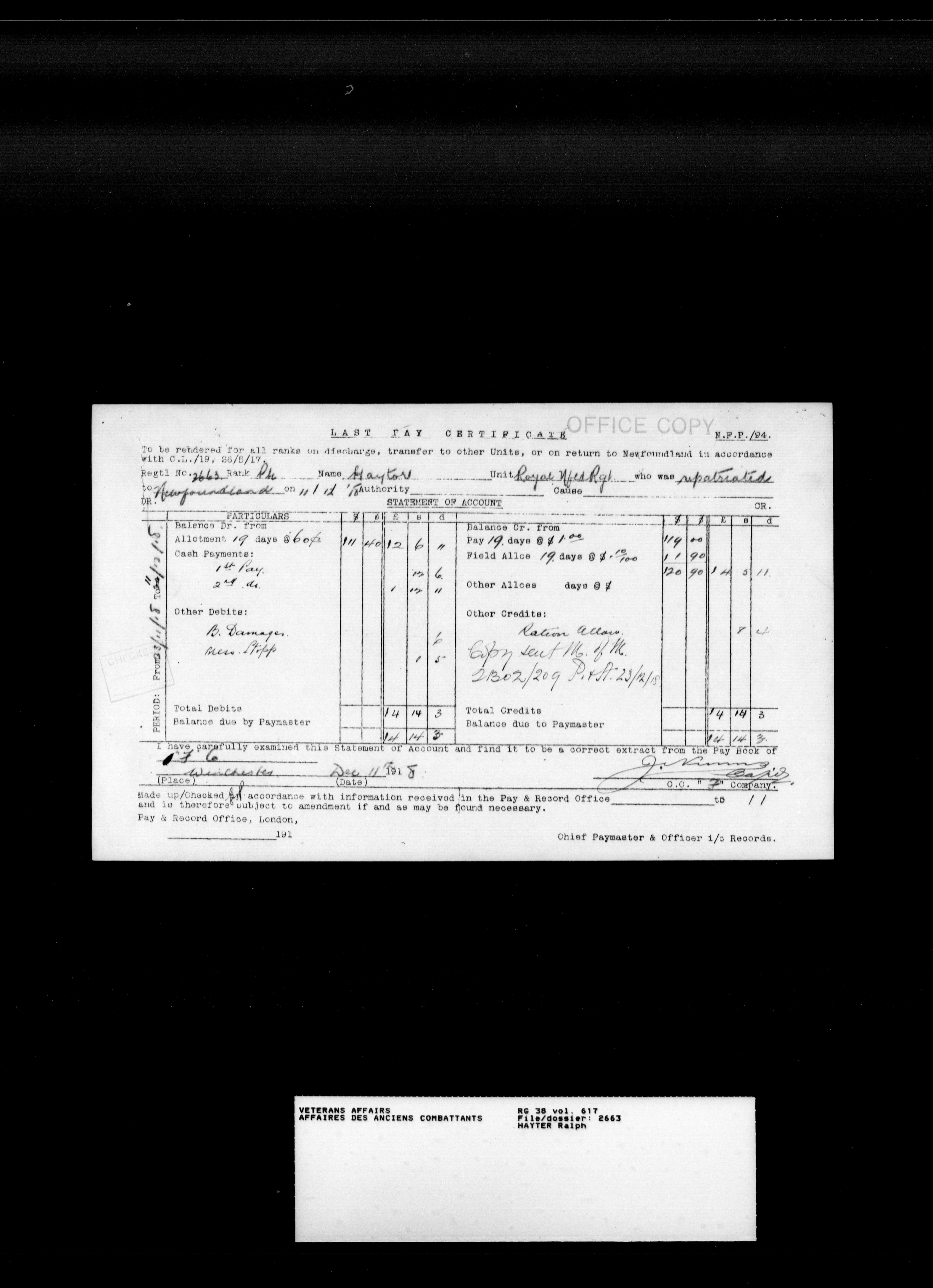 Military service files for members of the Royal Newfoundland Regiment and bandsmen and the Newfoundland Forestry Corps (1914-1919) - 18164