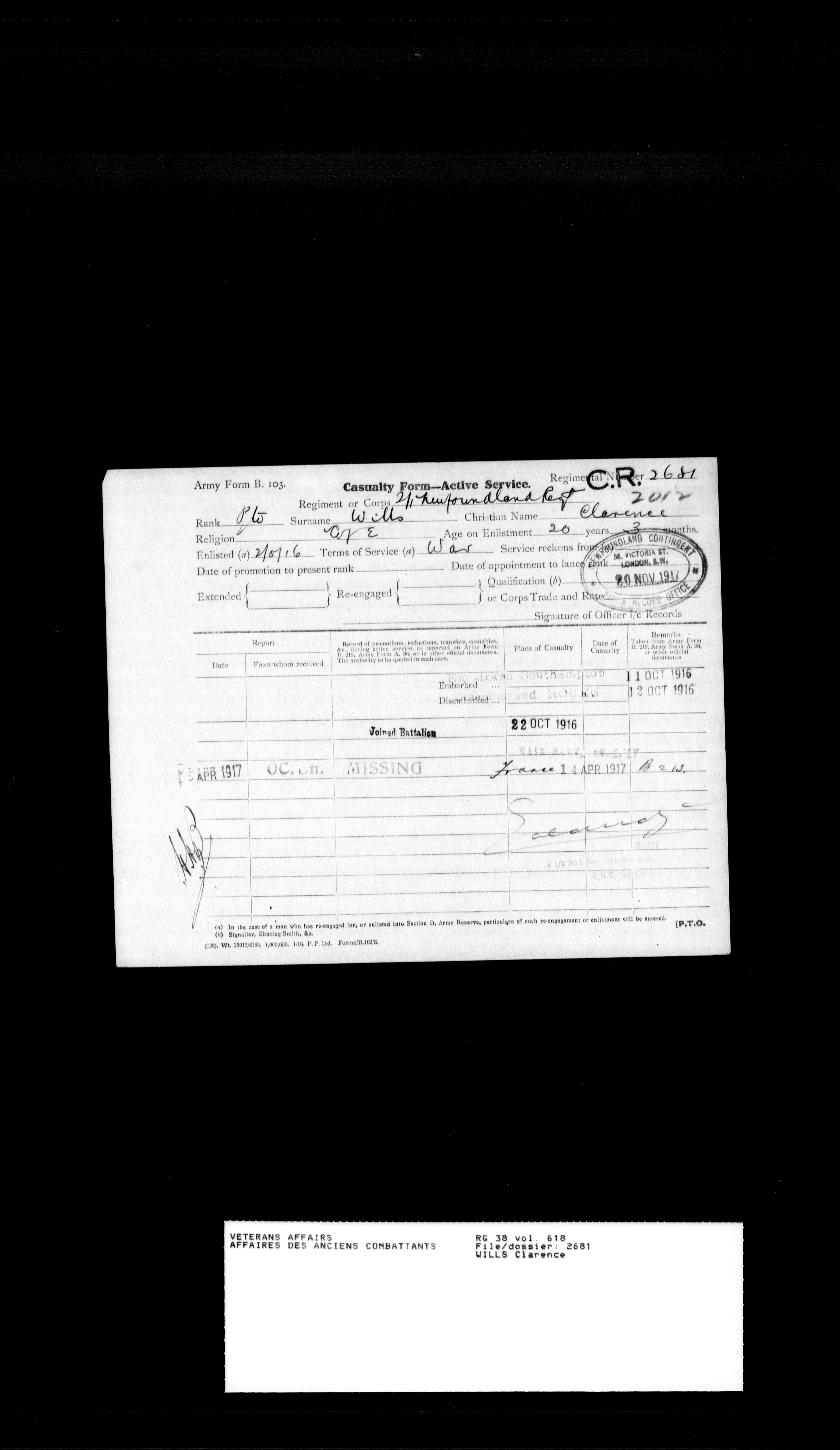 Military service files for members of the Royal Newfoundland Regiment and bandsmen and the Newfoundland Forestry Corps (1914-1919) - 18166