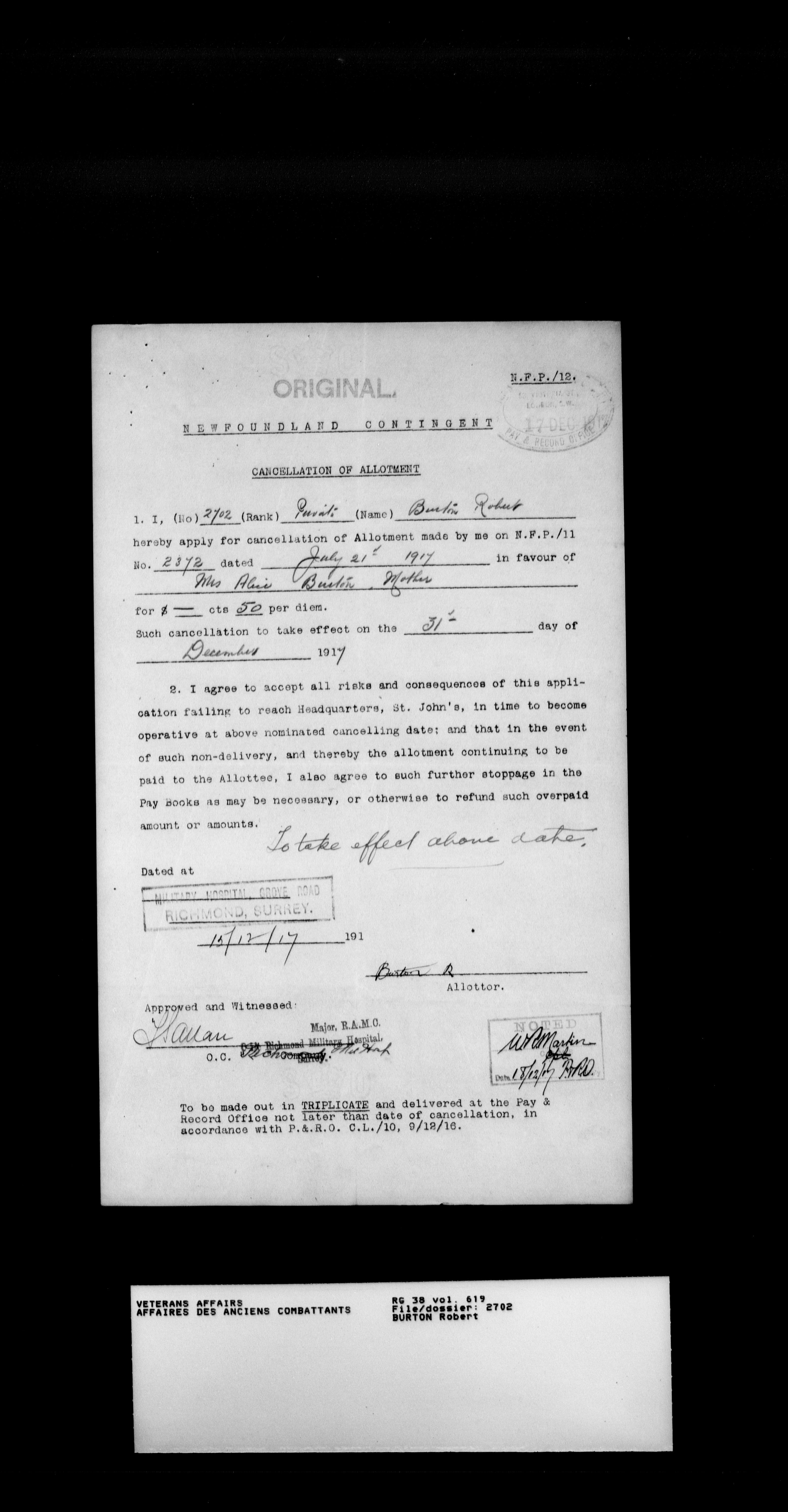 Military service files for members of the Royal Newfoundland Regiment and bandsmen and the Newfoundland Forestry Corps (1914-1919) - 18167