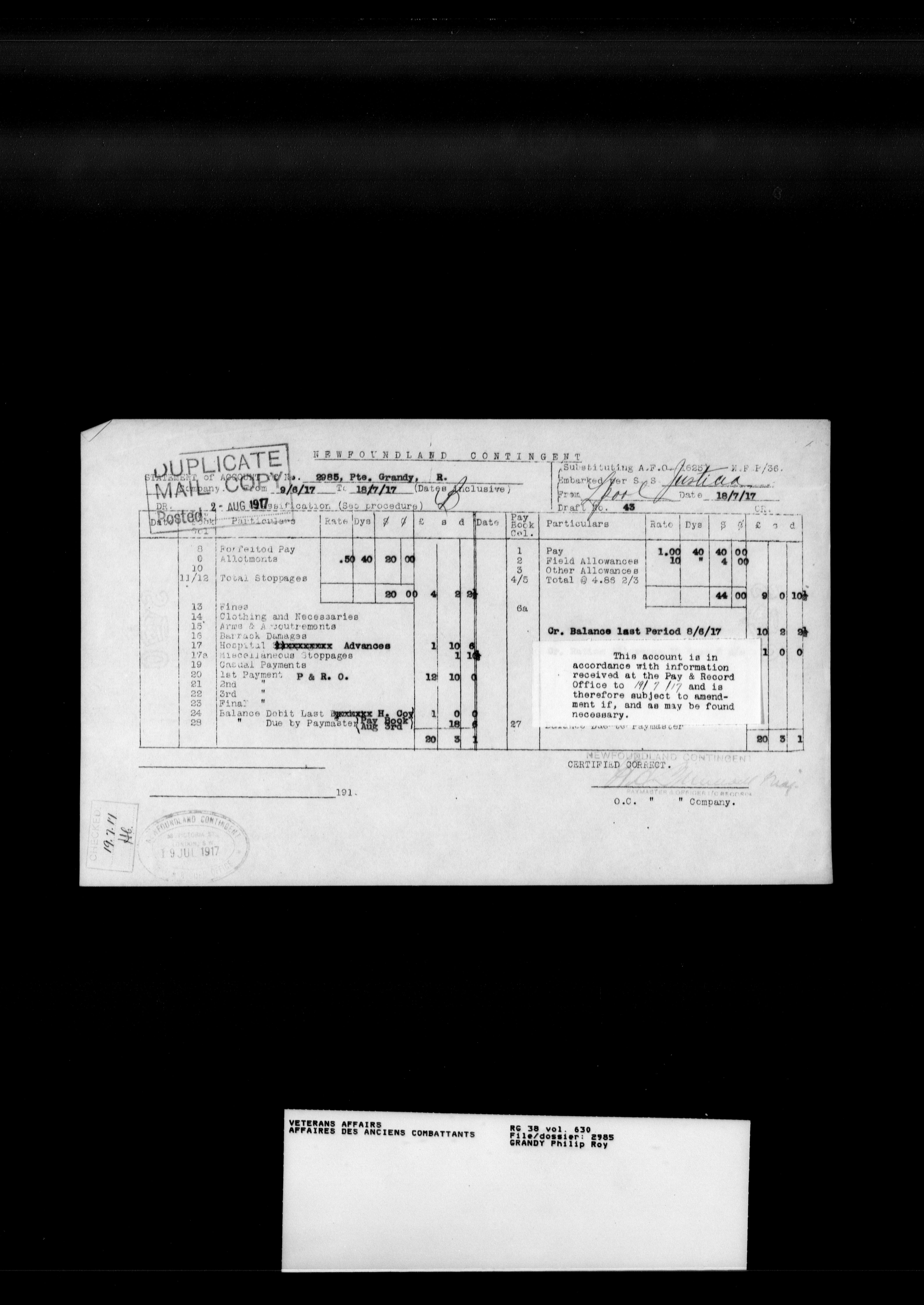 Military service files for members of the Royal Newfoundland Regiment and bandsmen and the Newfoundland Forestry Corps (1914-1919) - 18180