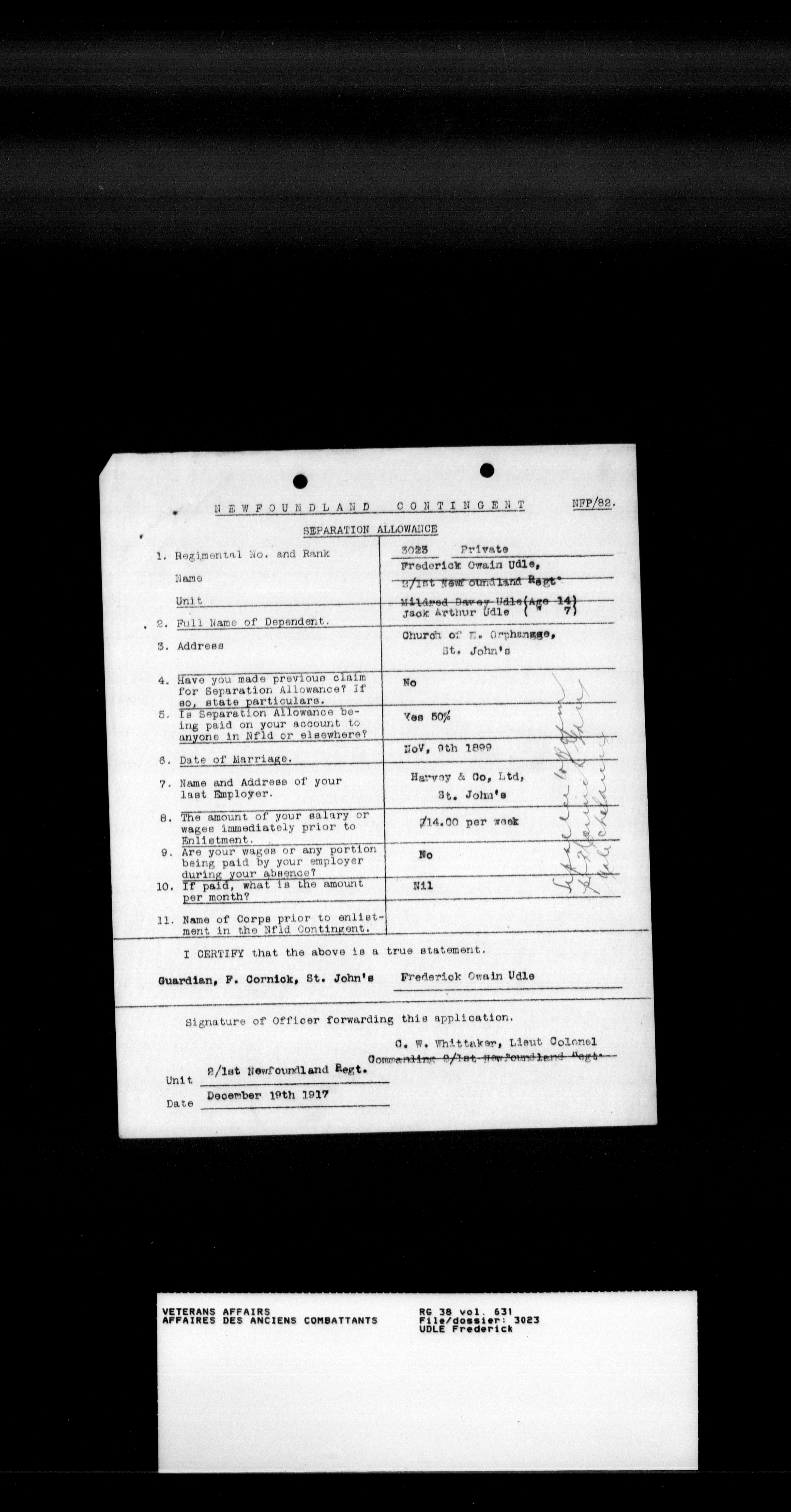 Military service files for members of the Royal Newfoundland Regiment and bandsmen and the Newfoundland Forestry Corps (1914-1919) - 18182