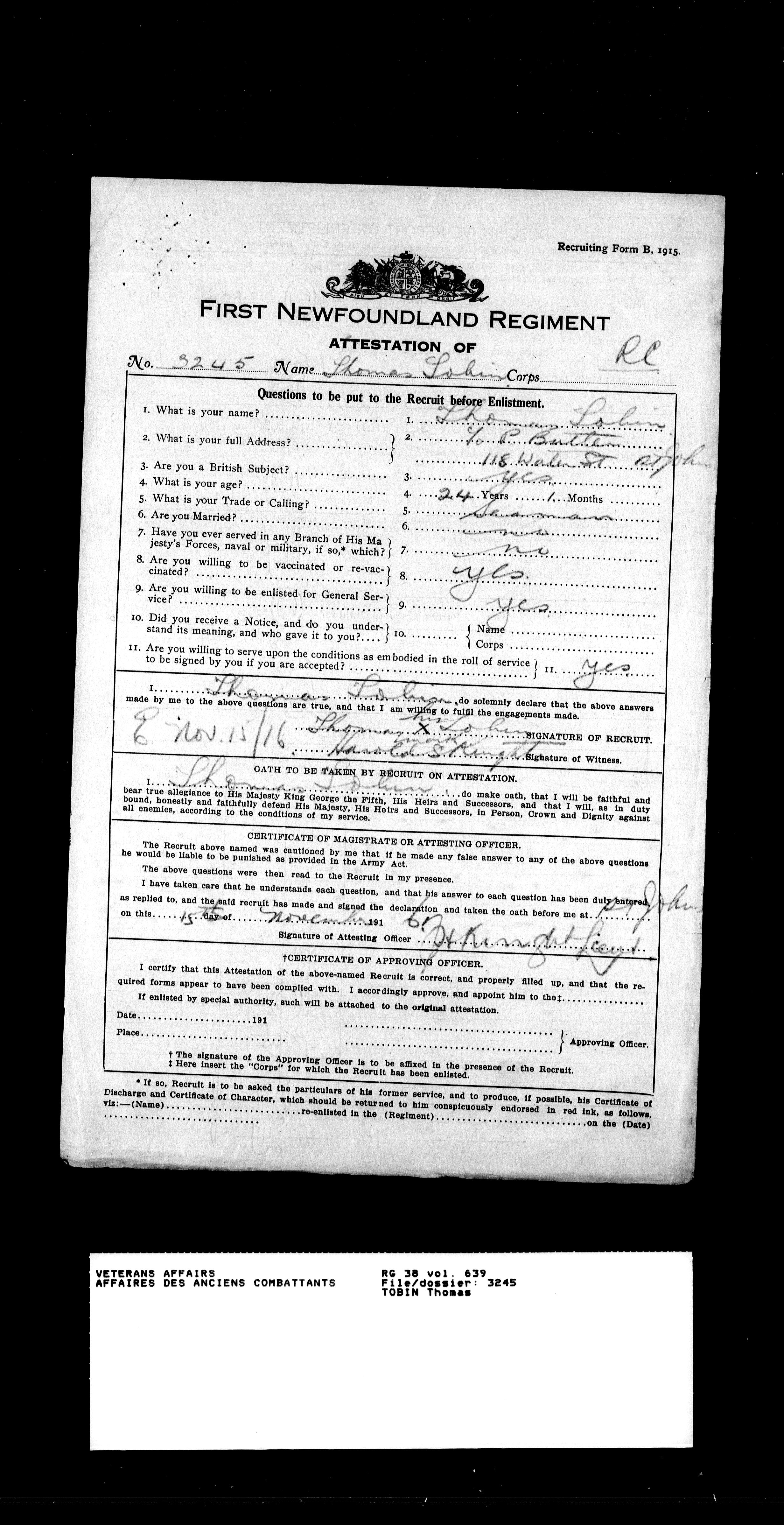 Military service files for members of the Royal Newfoundland Regiment and bandsmen and the Newfoundland Forestry Corps (1914-1919) - 18193