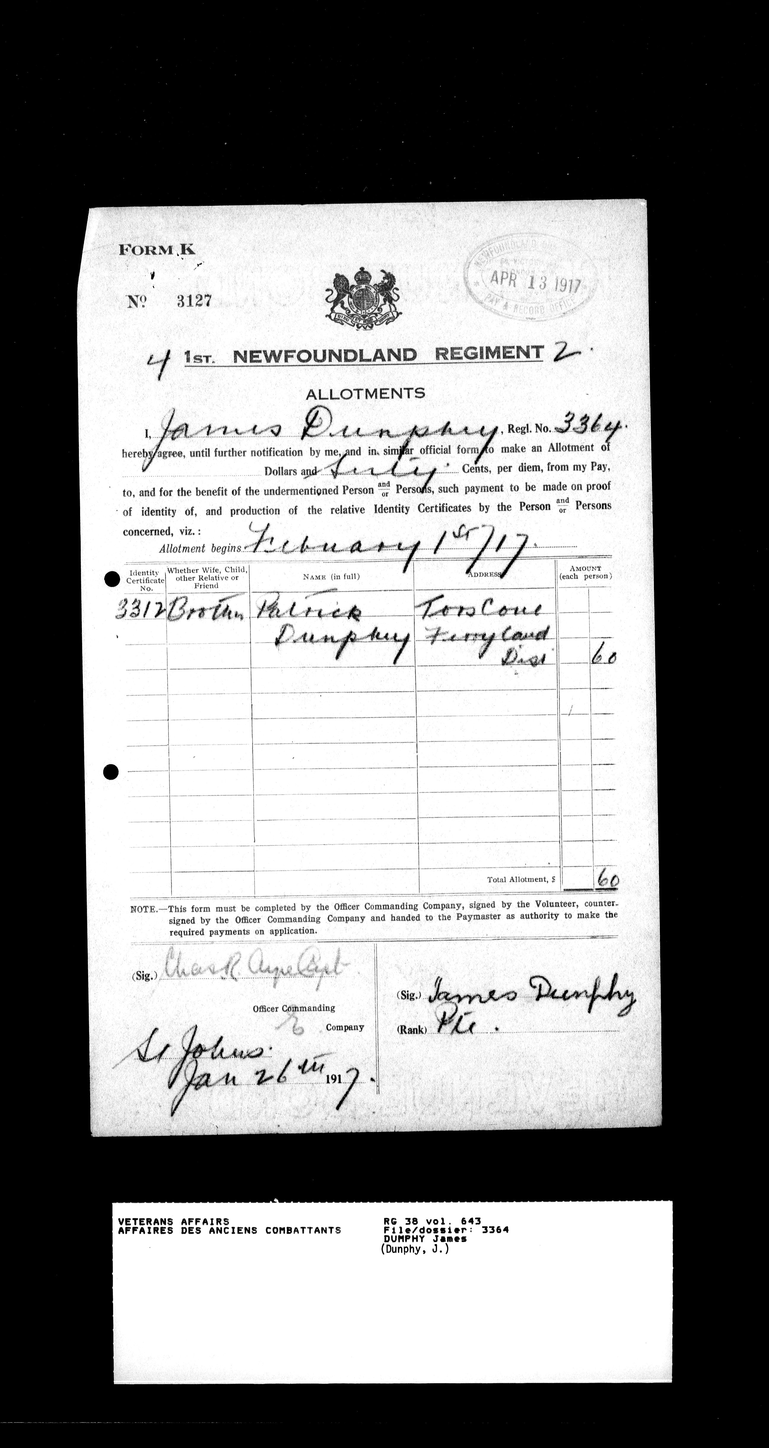 Military service files for members of the Royal Newfoundland Regiment and bandsmen and the Newfoundland Forestry Corps (1914-1919) - 18198