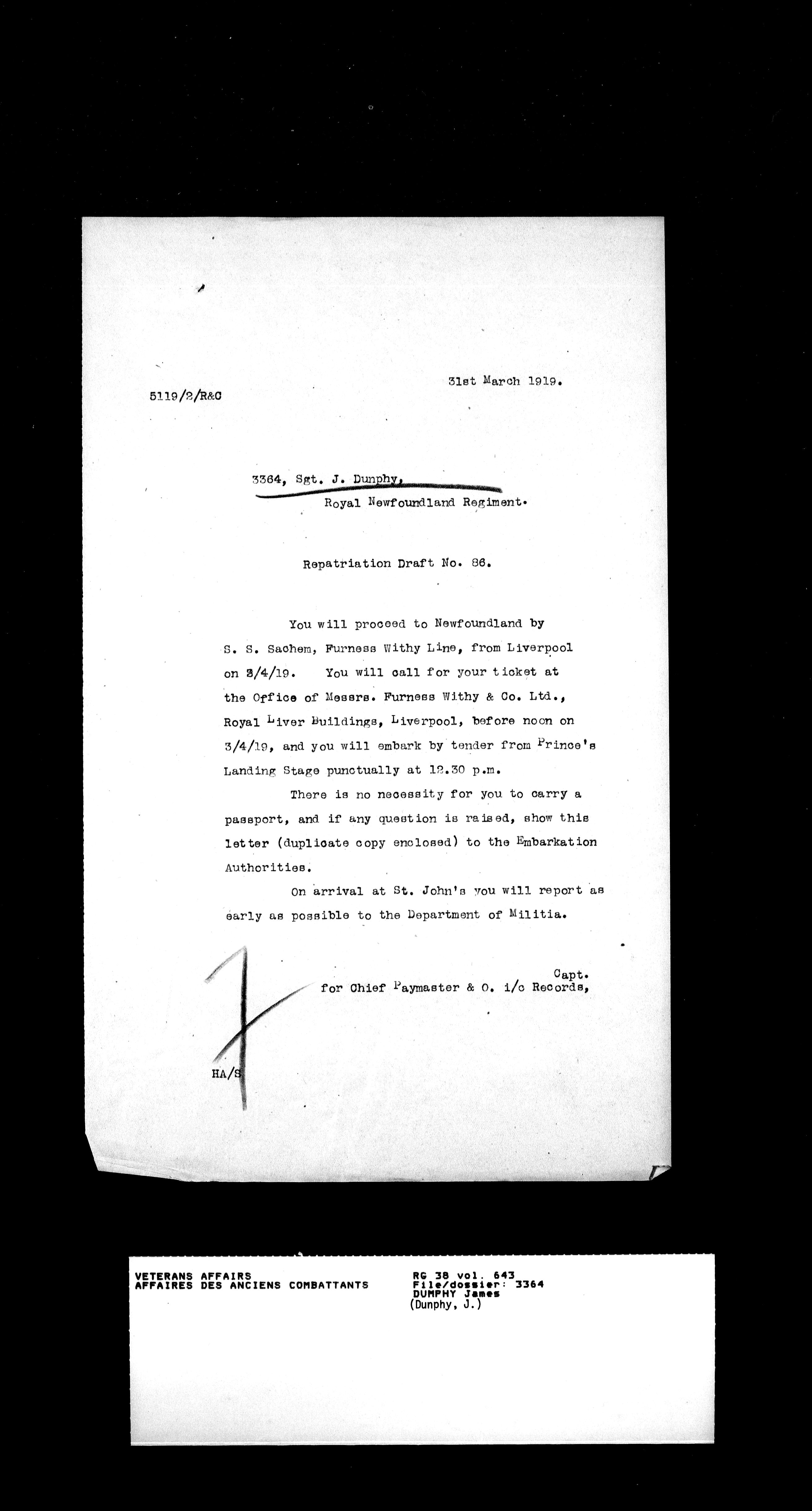 Military service files for members of the Royal Newfoundland Regiment and bandsmen and the Newfoundland Forestry Corps (1914-1919) - 18198
