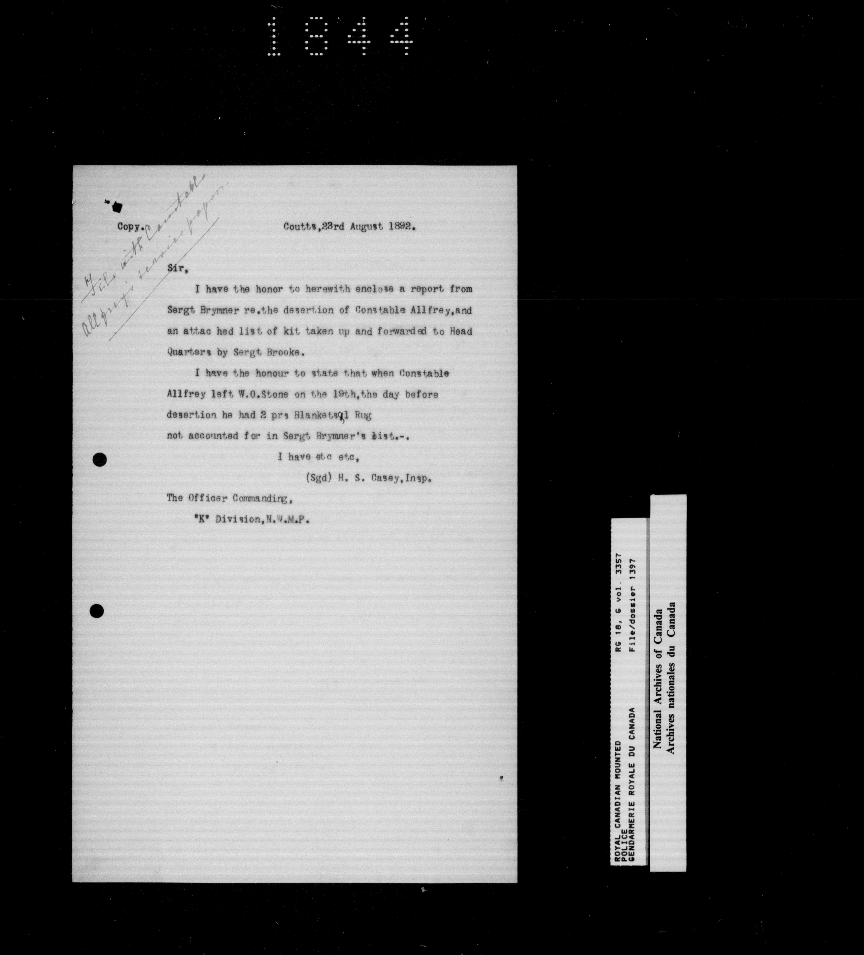 North West Mounted Police : Personnel files for members of the NWMP (1873-1904)