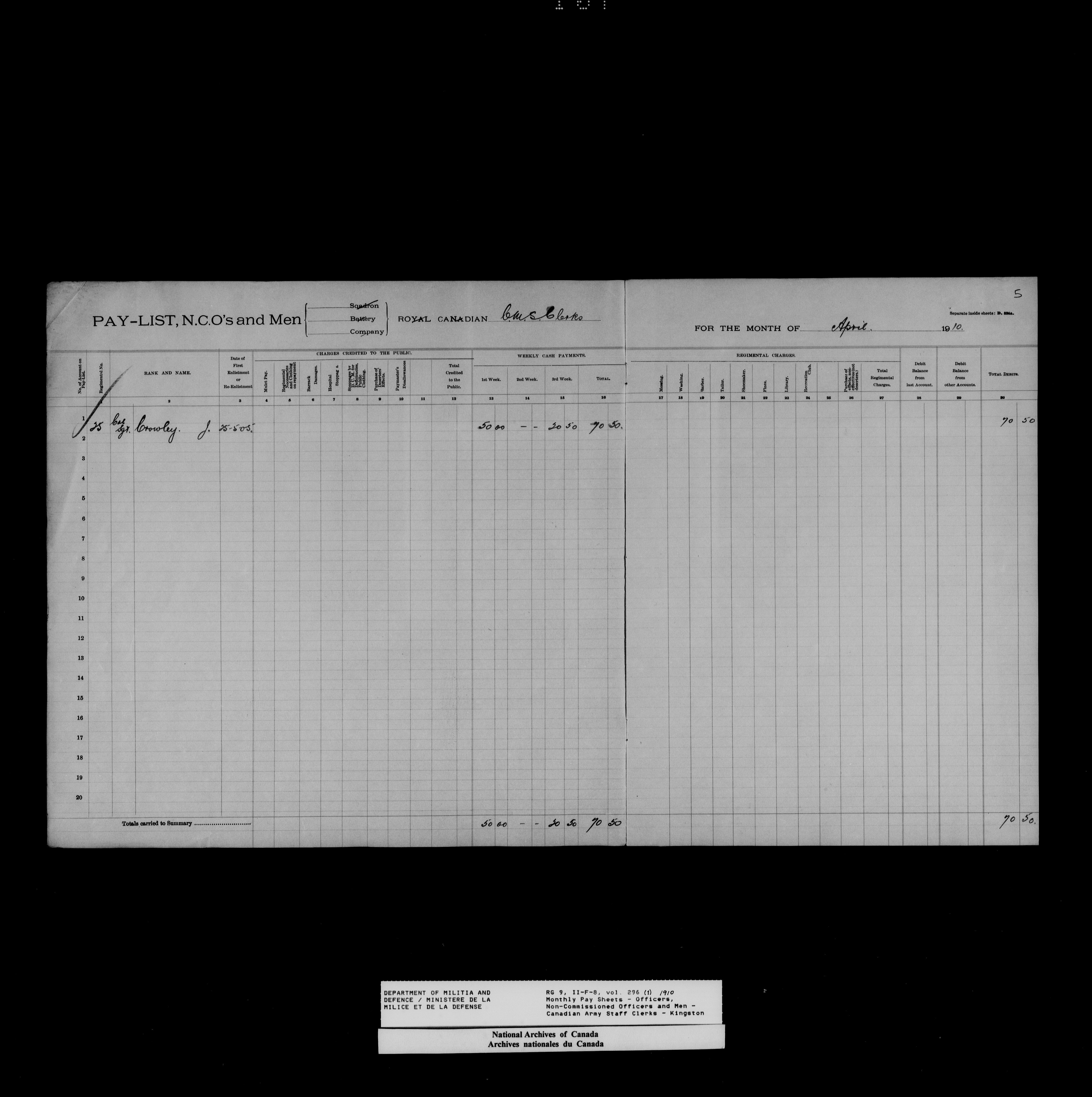 Nominal rolls and paylists for the Permanent Force (1871-1915) - 18445