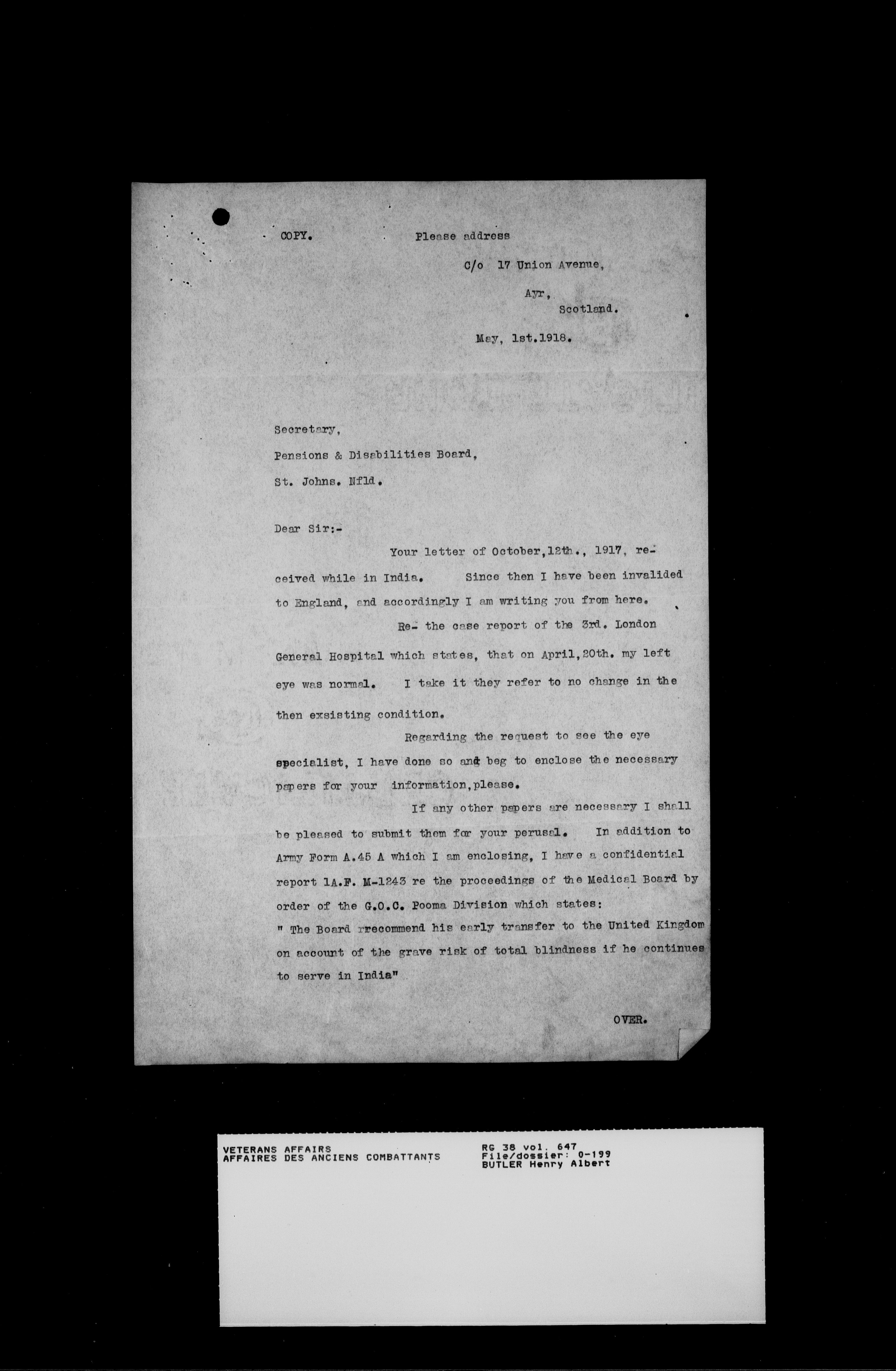 Military service files for members of the Royal Newfoundland Regiment and bandsmen and the Newfoundland Forestry Corps (1914-1919) - 18453