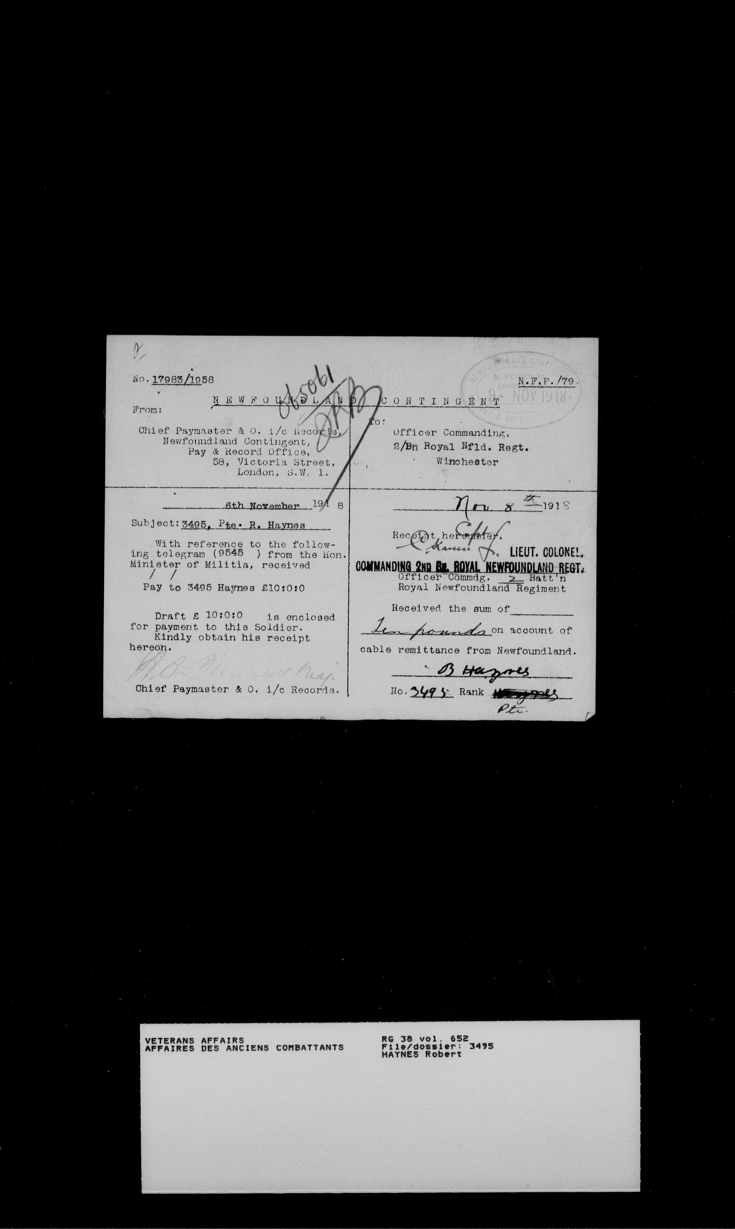 Military service files for members of the Royal Newfoundland Regiment and bandsmen and the Newfoundland Forestry Corps (1914-1919) - 18460