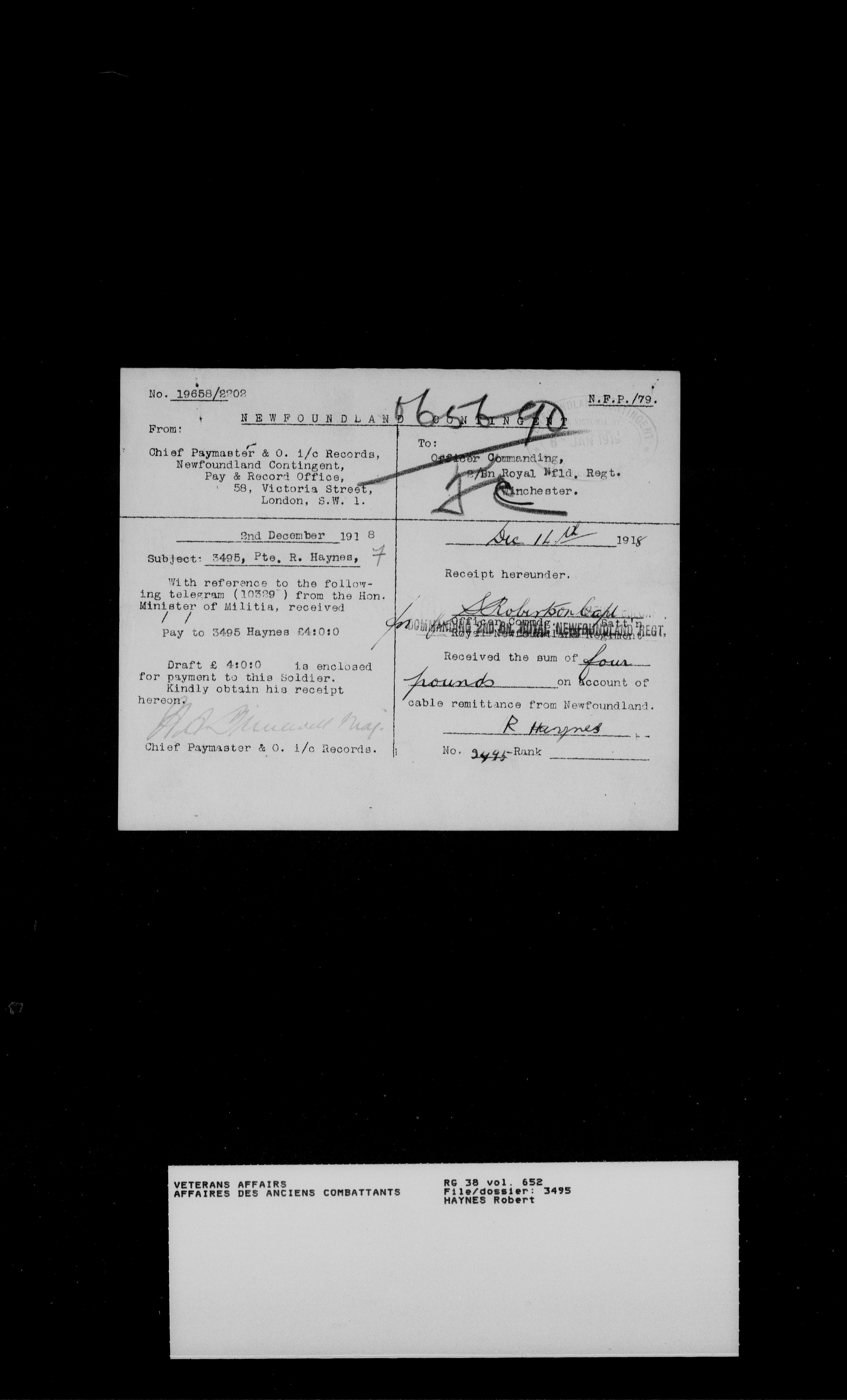 Military service files for members of the Royal Newfoundland Regiment and bandsmen and the Newfoundland Forestry Corps (1914-1919) - 18460