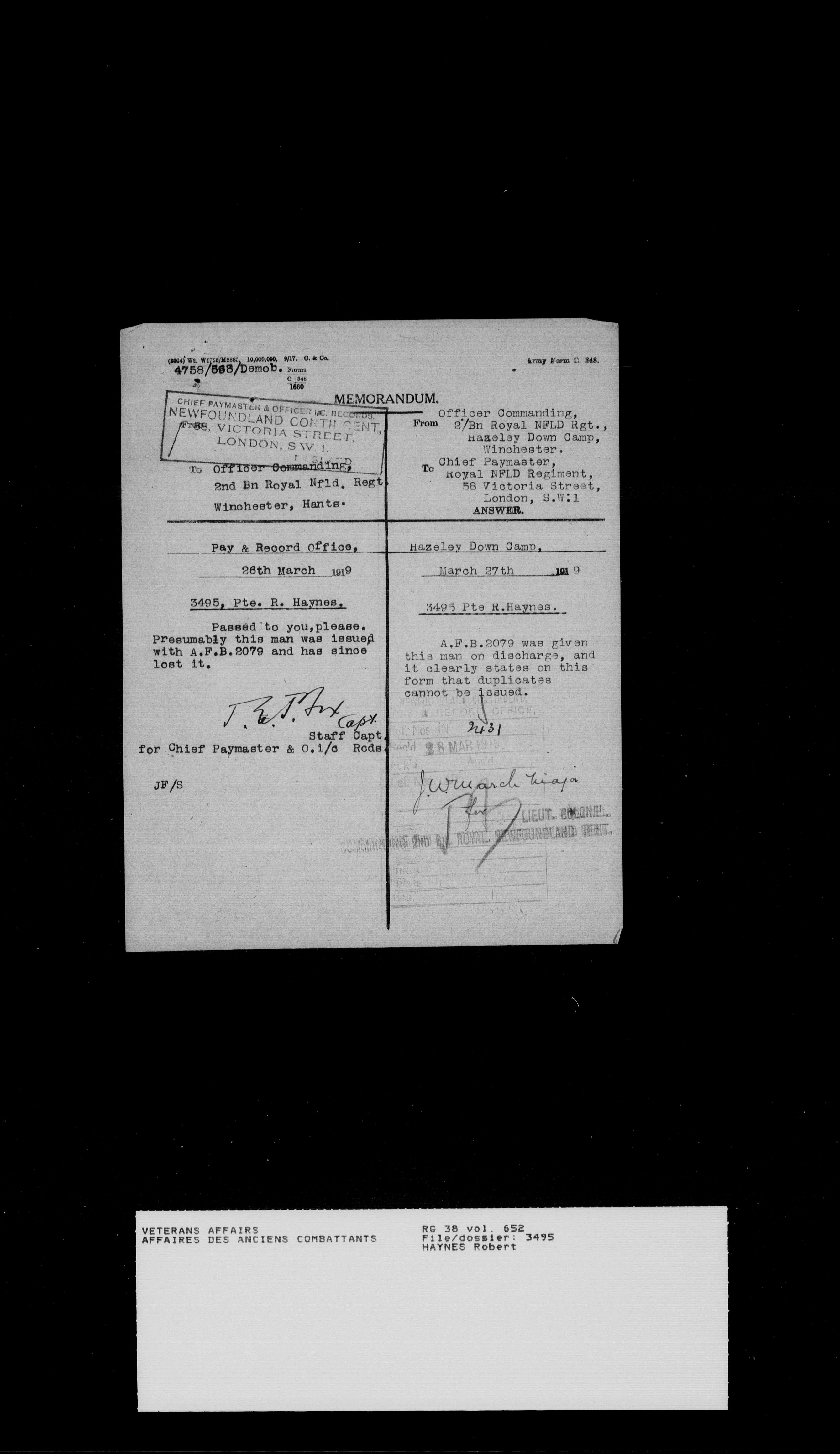 Military service files for members of the Royal Newfoundland Regiment and bandsmen and the Newfoundland Forestry Corps (1914-1919) - 18460