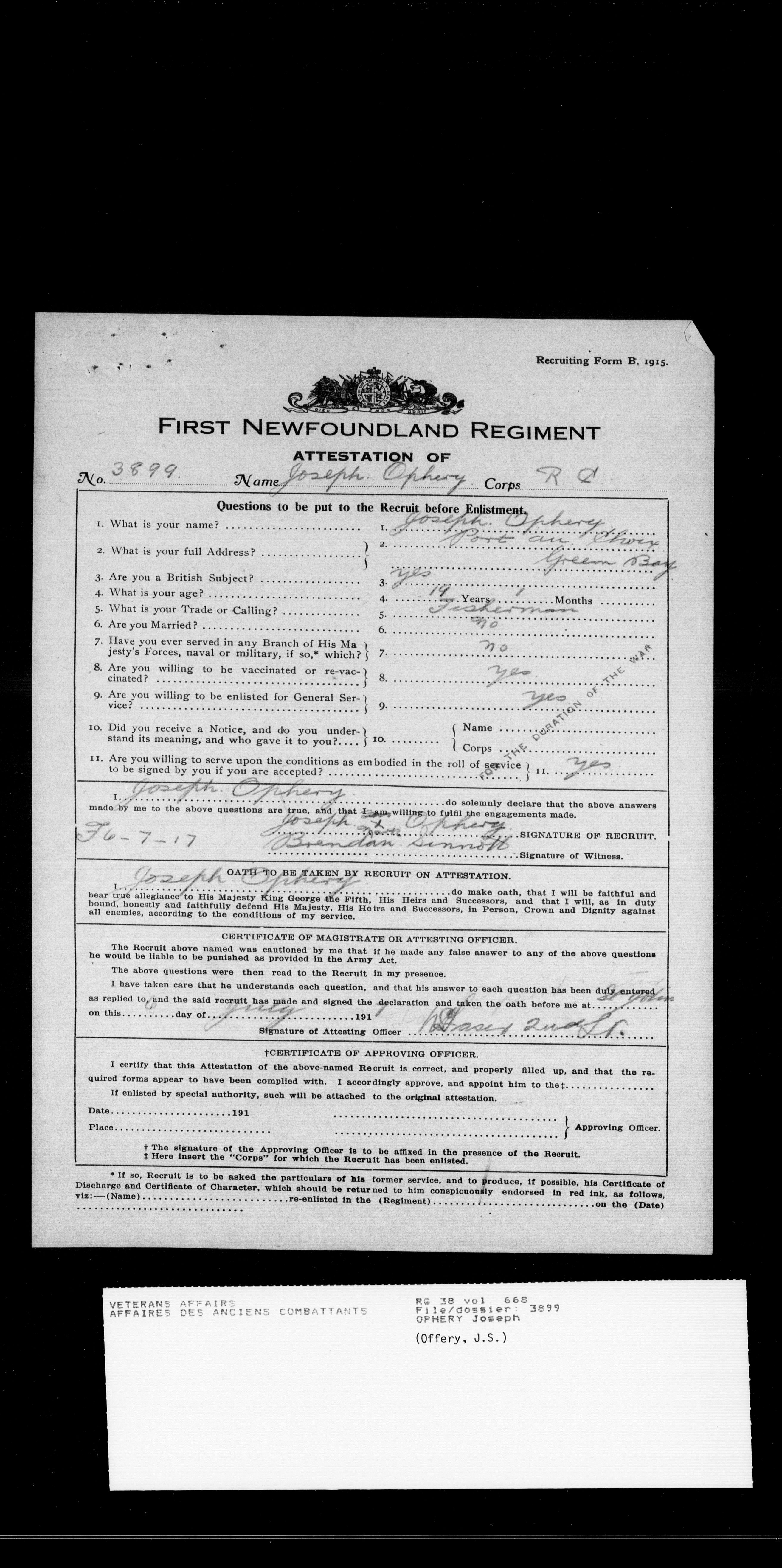 Military service files for members of the Royal Newfoundland Regiment and bandsmen and the Newfoundland Forestry Corps (1914-1919) - 18482