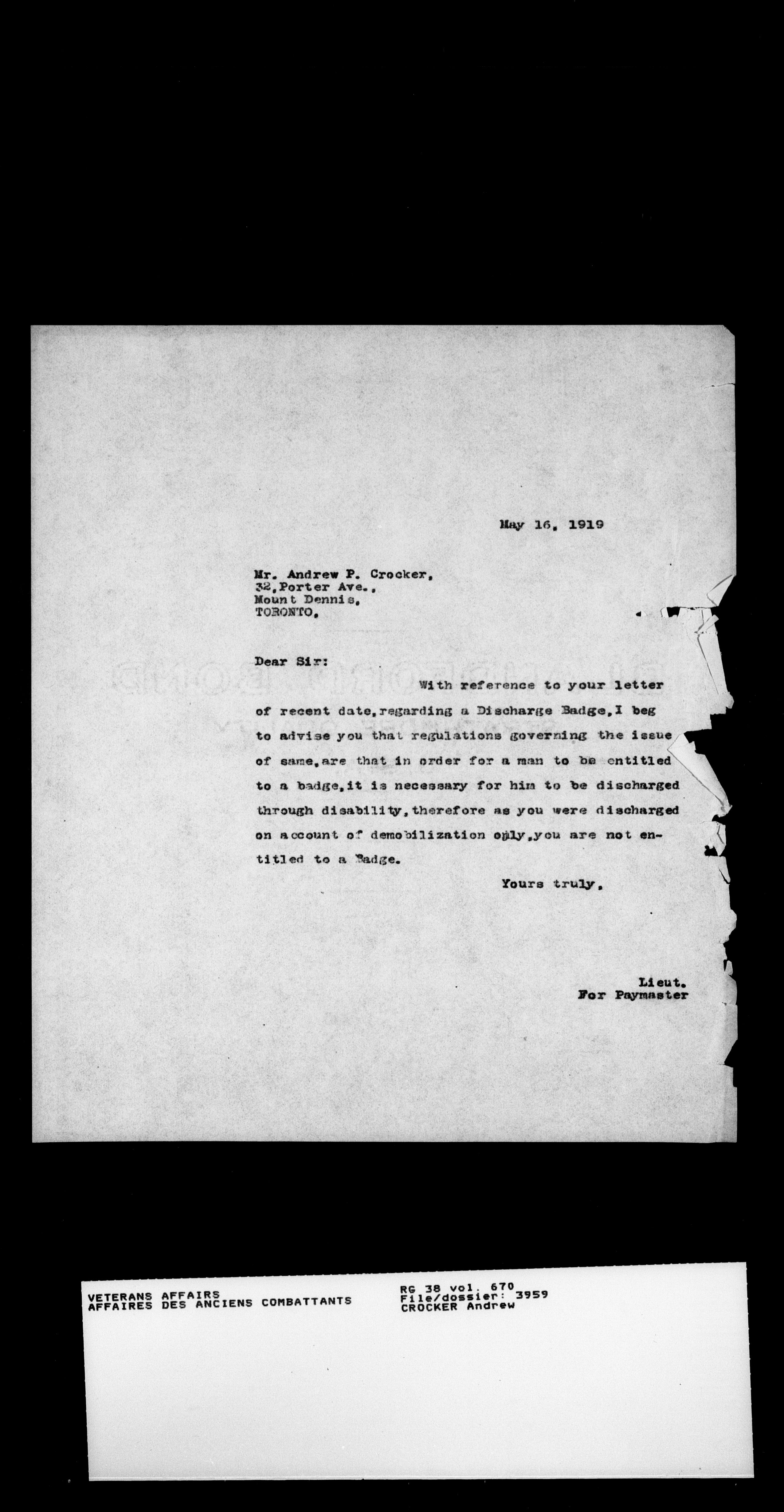 Military service files for members of the Royal Newfoundland Regiment and bandsmen and the Newfoundland Forestry Corps (1914-1919) - 18484
