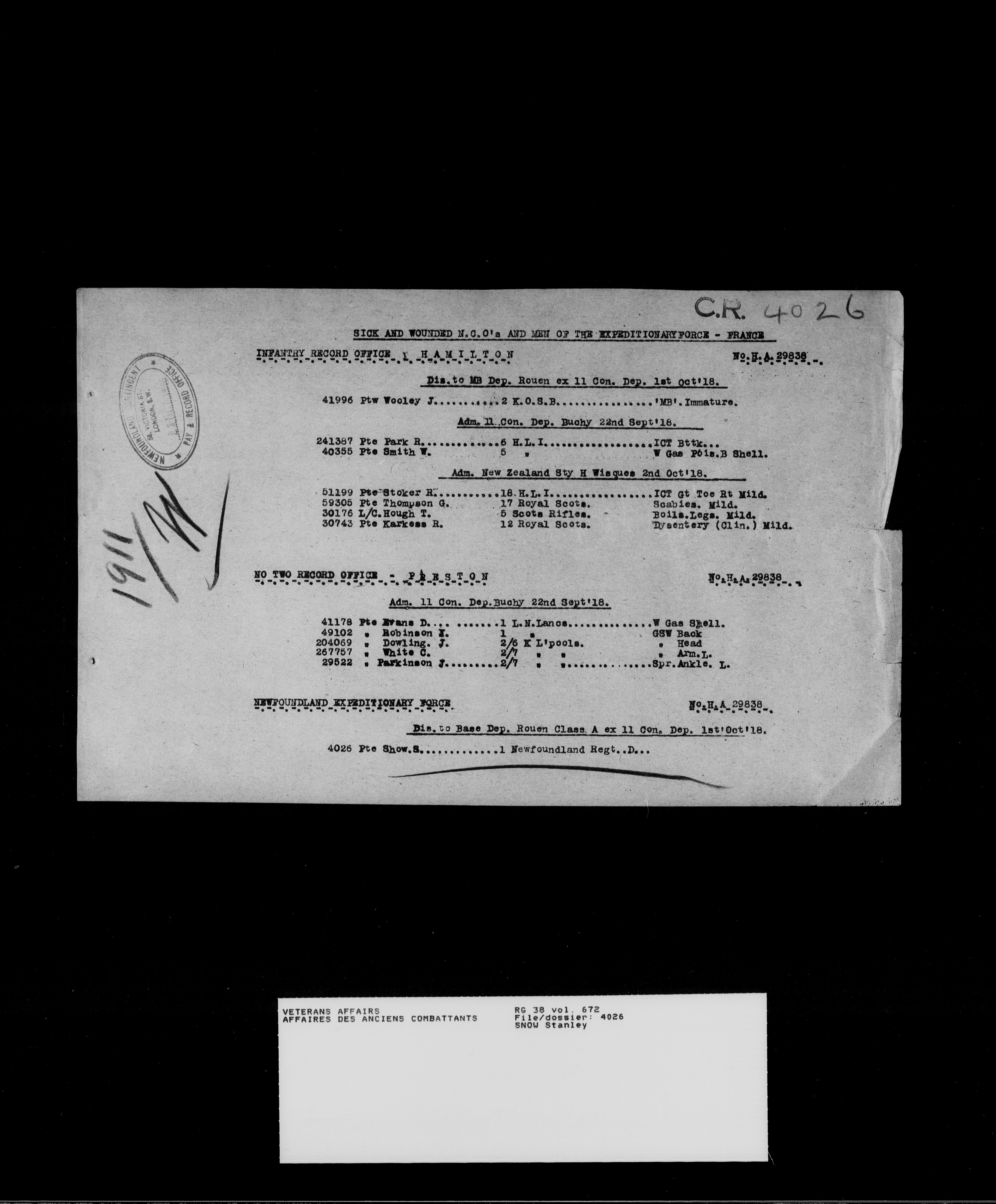 Military service files for members of the Royal Newfoundland Regiment and bandsmen and the Newfoundland Forestry Corps (1914-1919) - 18488