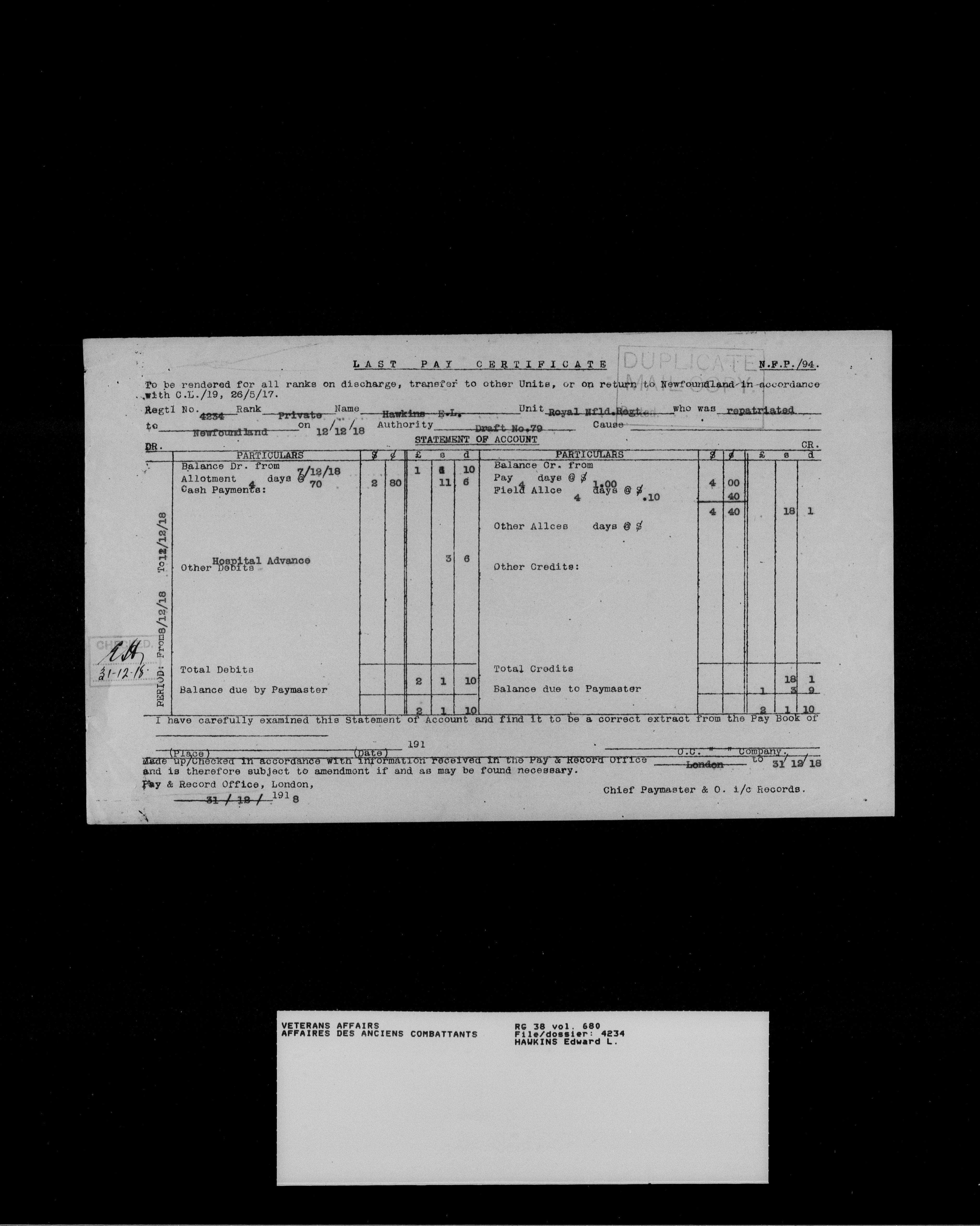 Military service files for members of the Royal Newfoundland Regiment and bandsmen and the Newfoundland Forestry Corps (1914-1919) - 18497