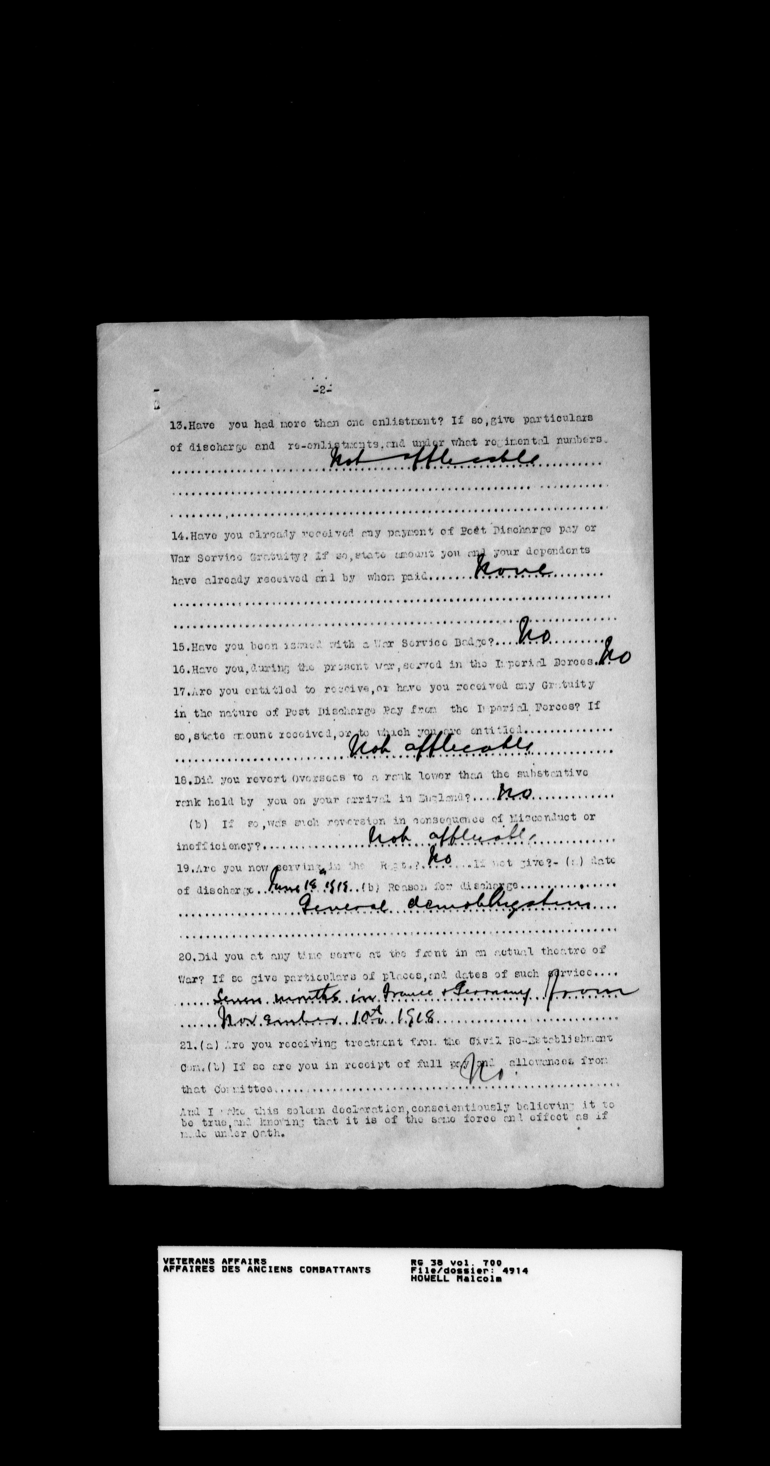 Military service files for members of the Royal Newfoundland Regiment and bandsmen and the Newfoundland Forestry Corps (1914-1919) - 18521