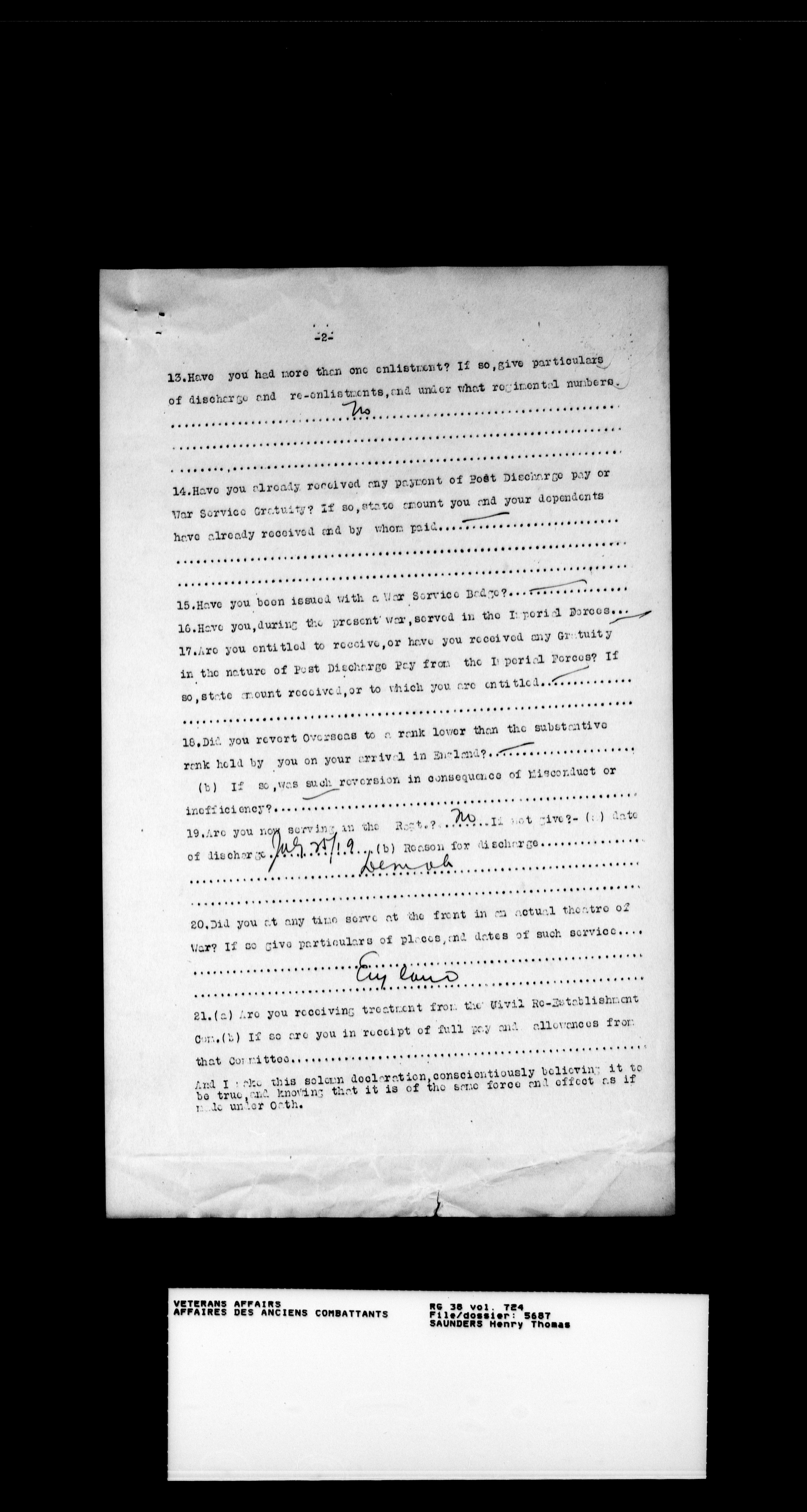 Military service files for members of the Royal Newfoundland Regiment and bandsmen and the Newfoundland Forestry Corps (1914-1919) - 18550