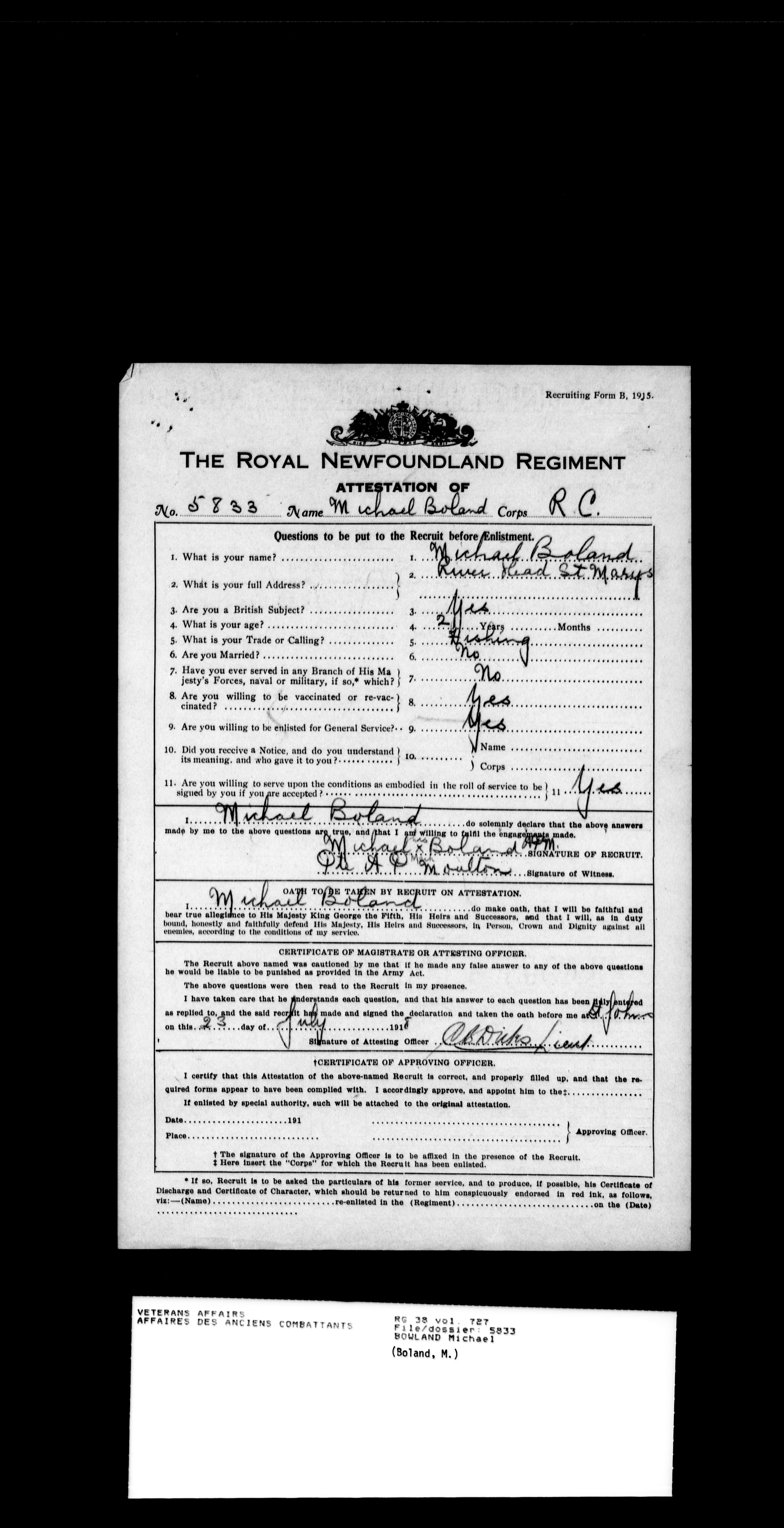 Military service files for members of the Royal Newfoundland Regiment and bandsmen and the Newfoundland Forestry Corps (1914-1919) - 18552