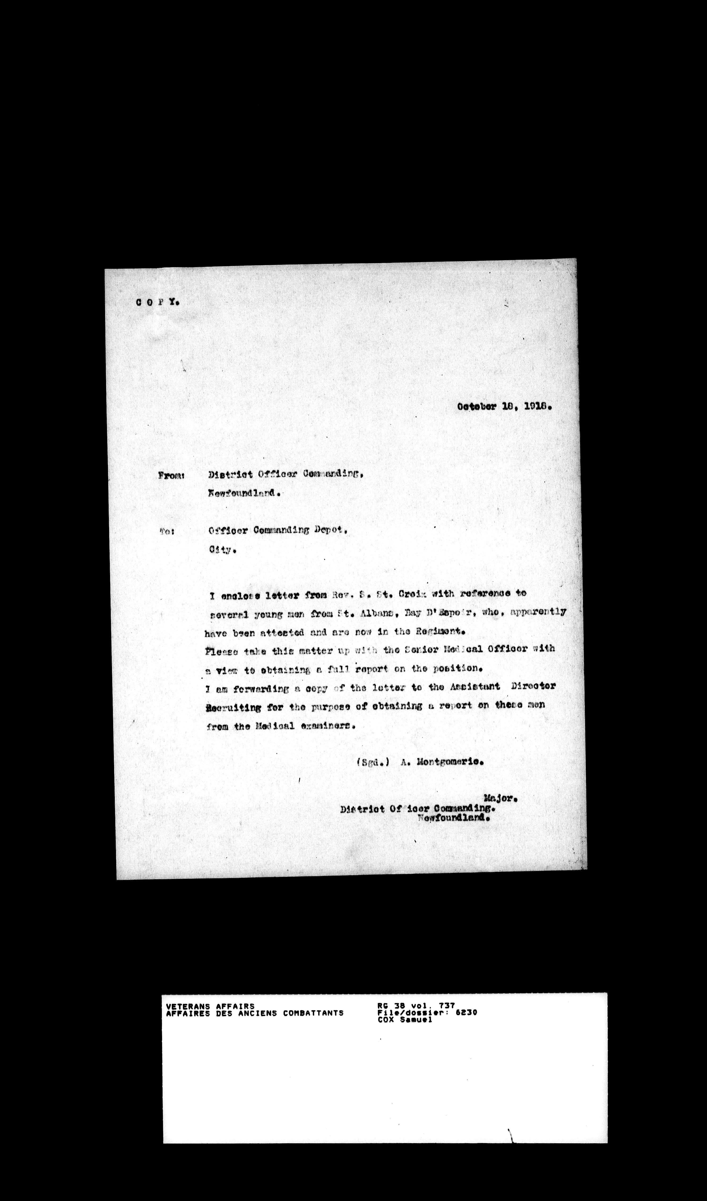 Military service files for members of the Royal Newfoundland Regiment and bandsmen and the Newfoundland Forestry Corps (1914-1919) - 18561