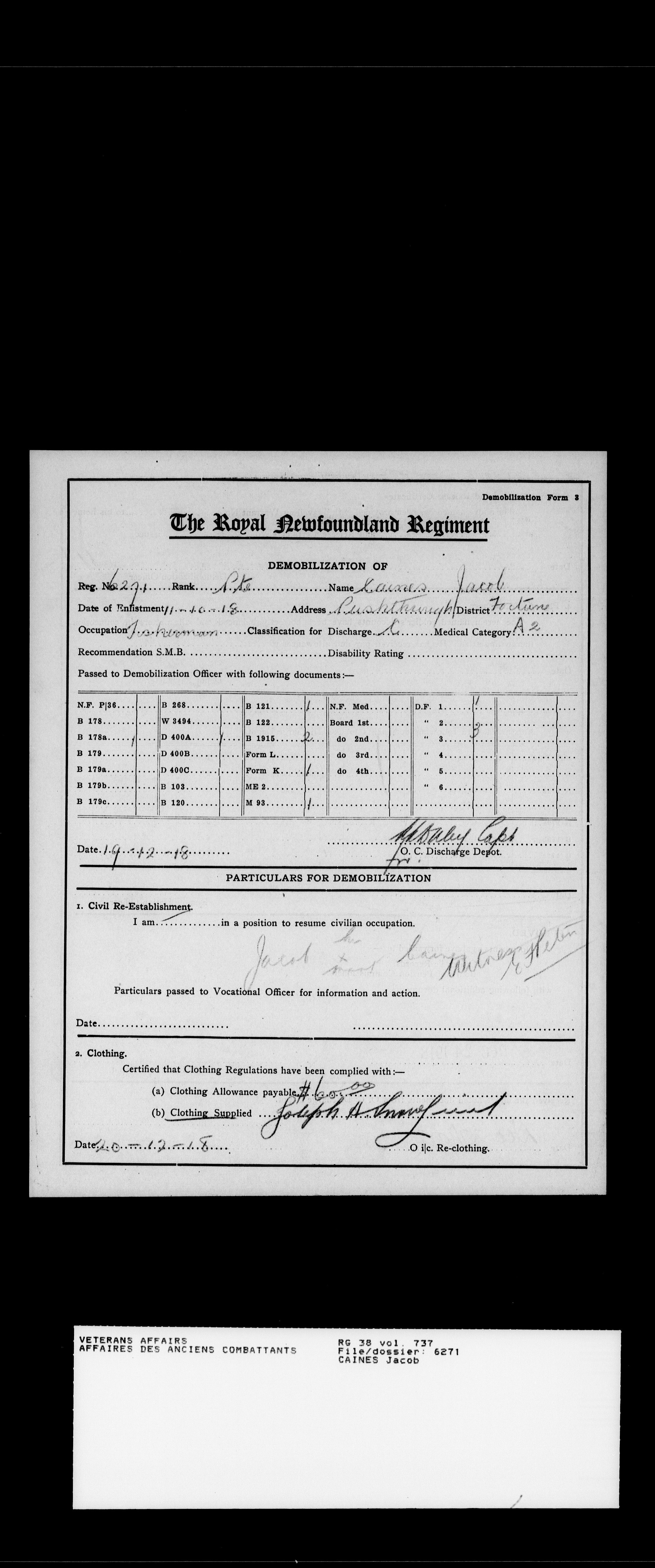 Military service files for members of the Royal Newfoundland Regiment and bandsmen and the Newfoundland Forestry Corps (1914-1919) - 18562
