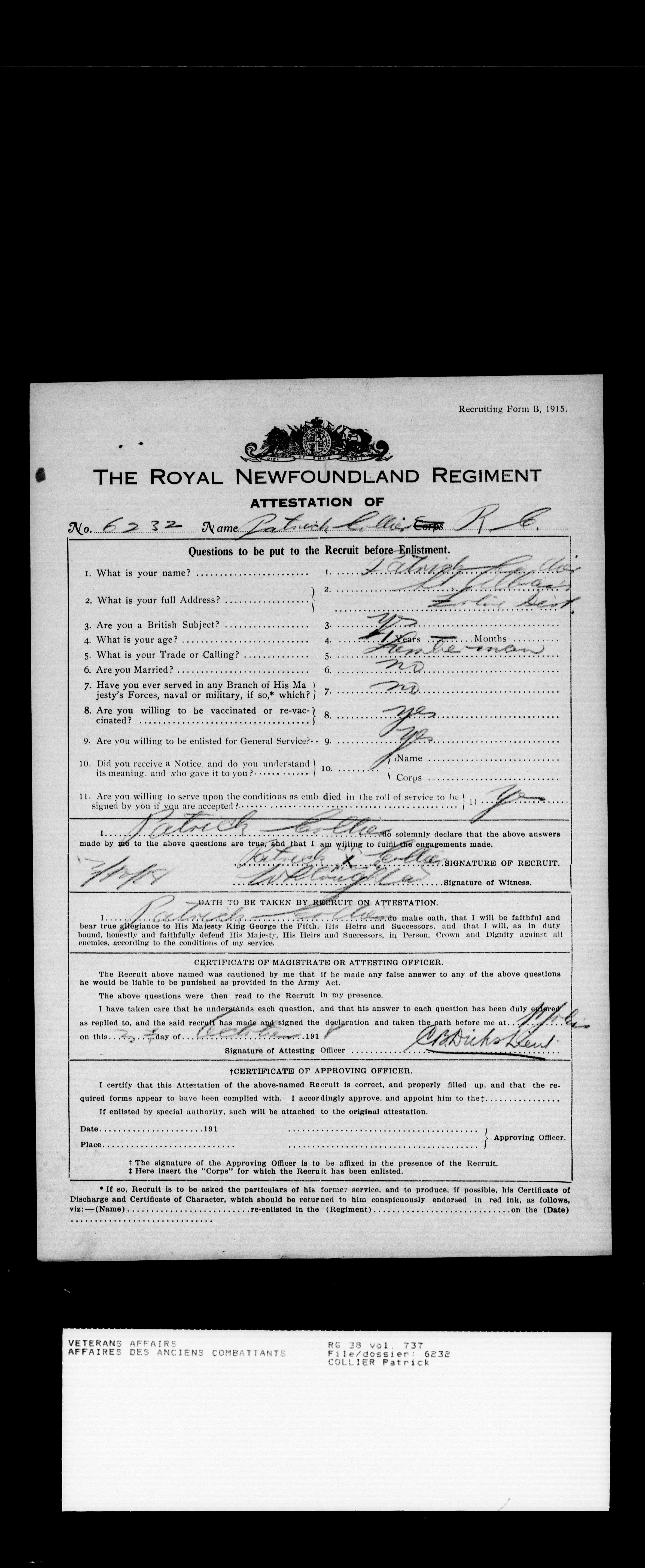 Military service files for members of the Royal Newfoundland Regiment and bandsmen and the Newfoundland Forestry Corps (1914-1919) - 18562