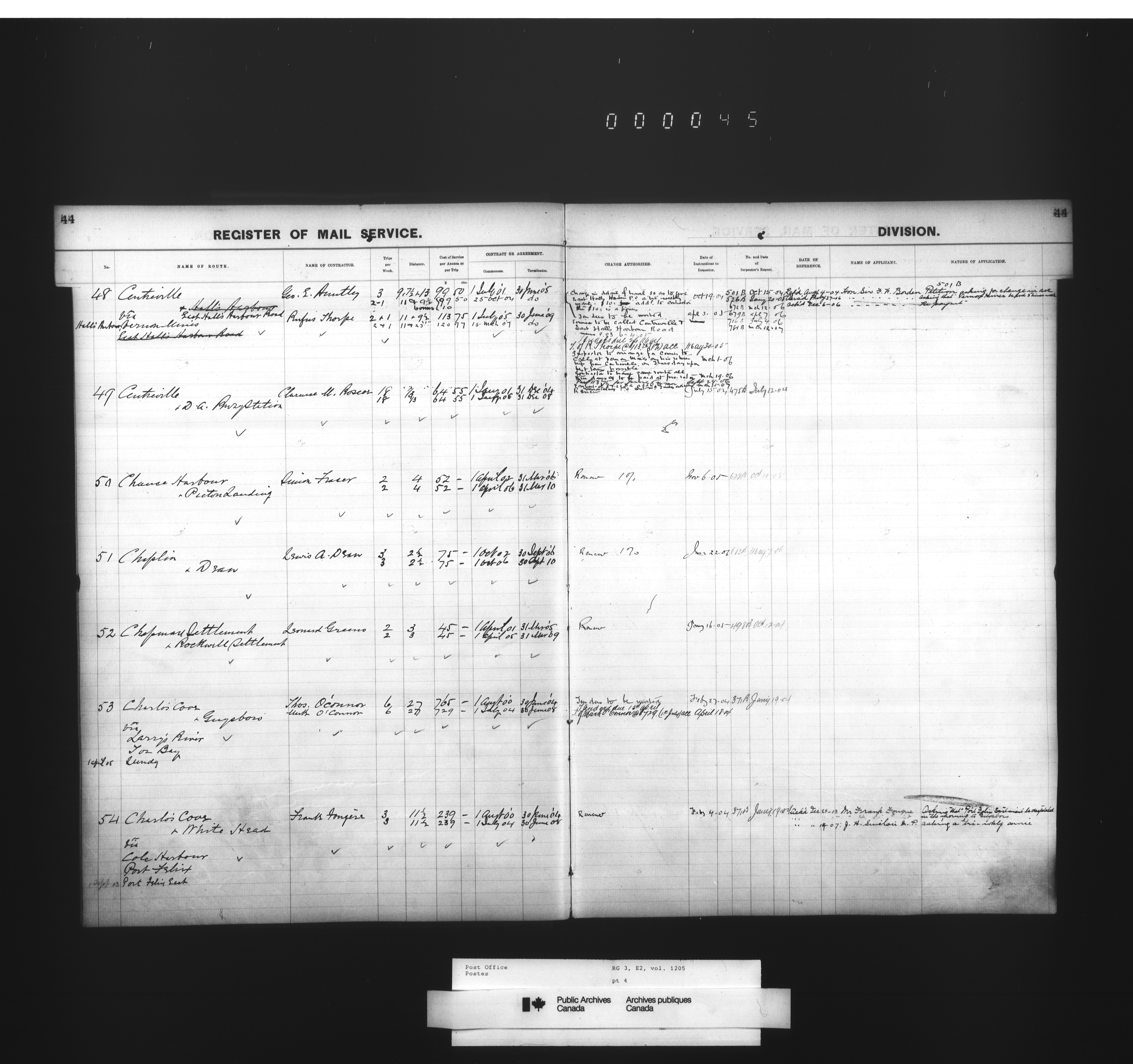 Post Office Department, Transportation Branch : Mail service contract registers - 2053
