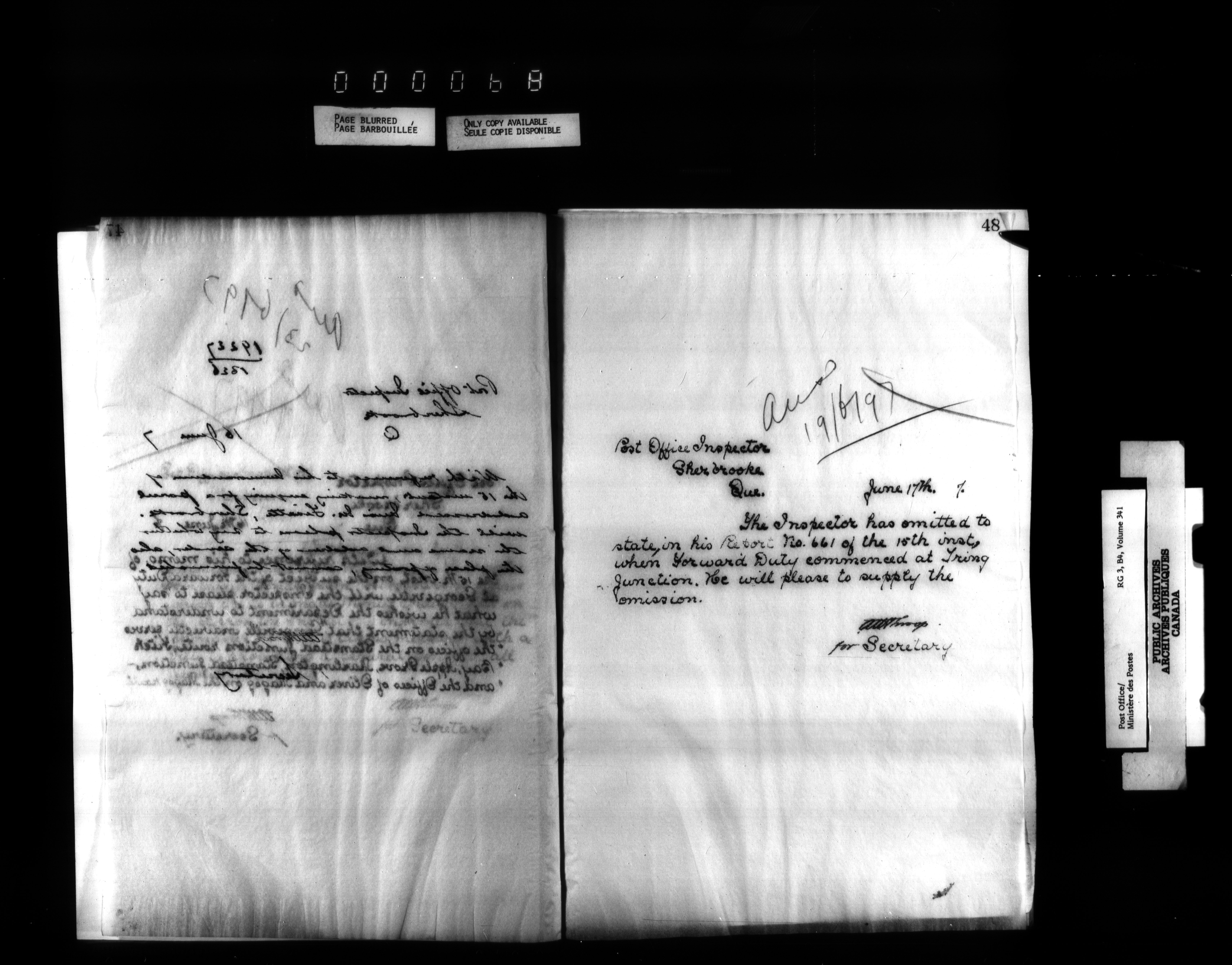 Correspondence from the Secretary to Post Office Inspectors : Letterbooks, Quebec- Quebec - 2230