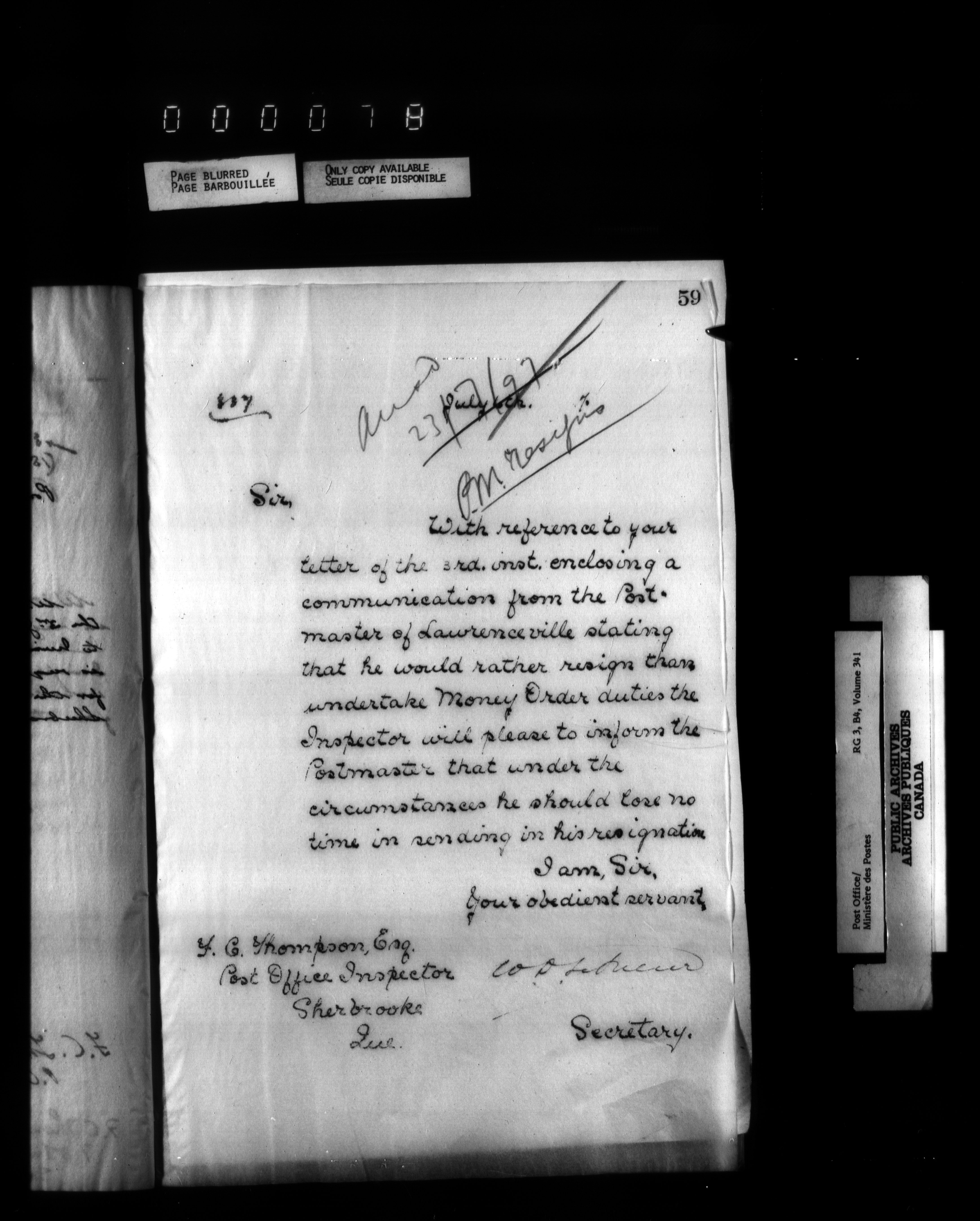 Correspondence from the Secretary to Post Office Inspectors : Letterbooks, Quebec- Quebec - 2230
