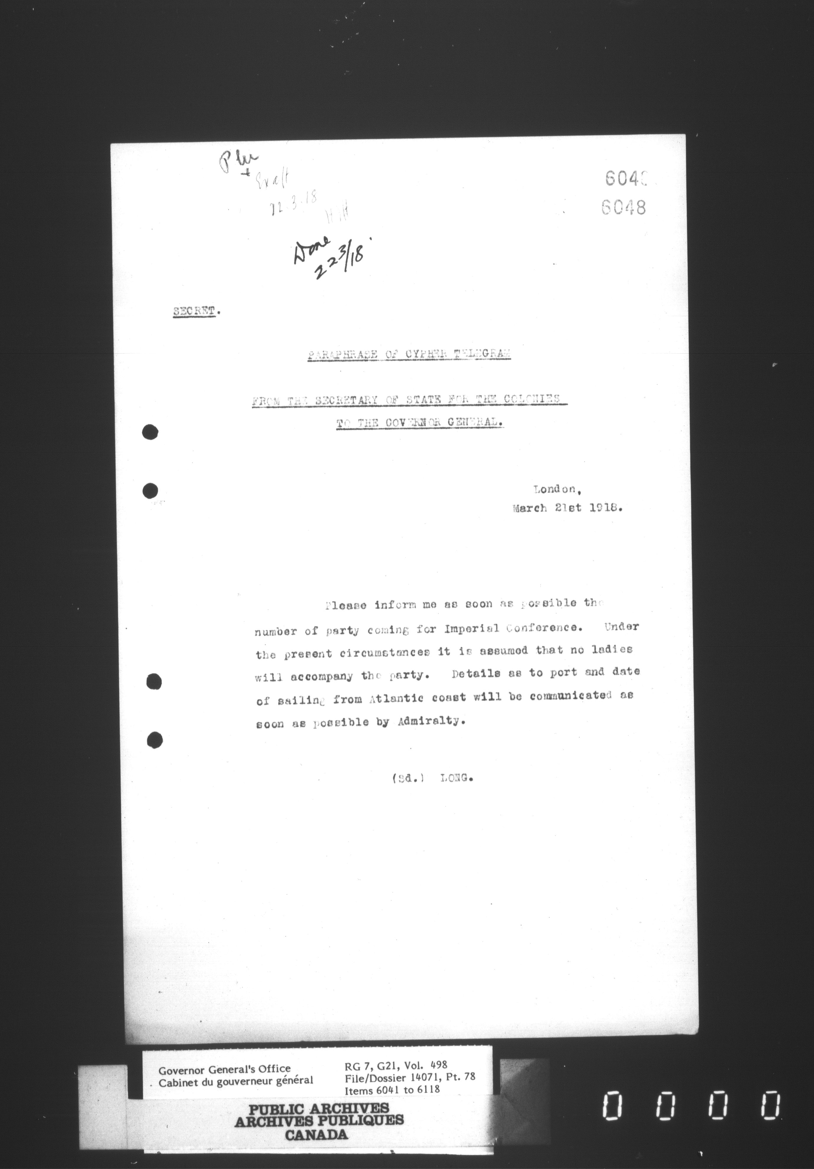 [Governor General] numbered files - 2321