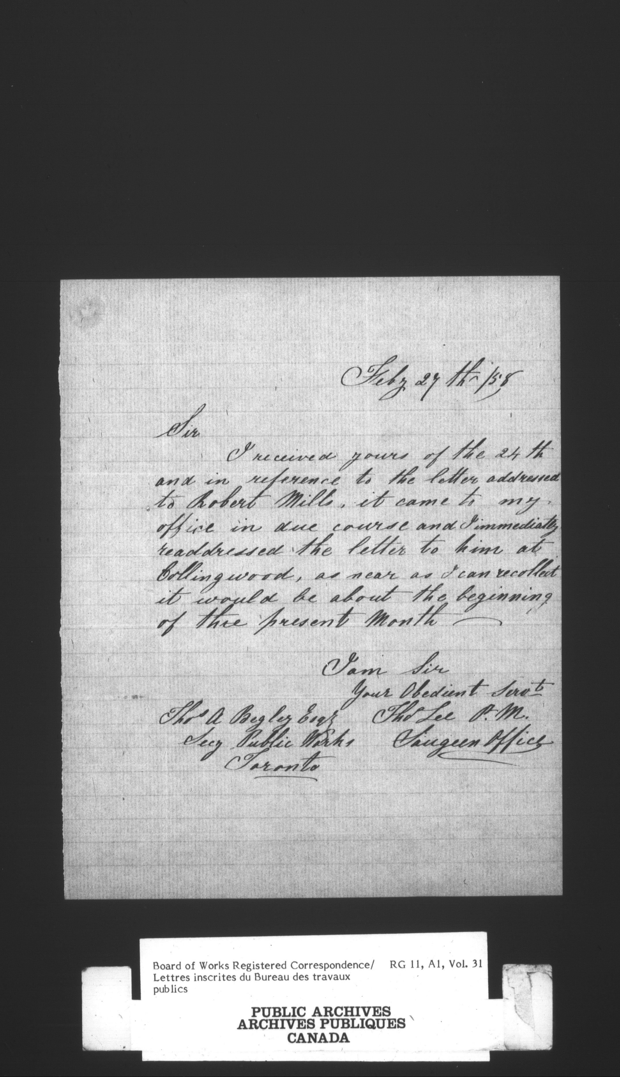 Department of Public Works, Board of Works records, official correspondence : Registered correspondence, 1842-1860 : T-2384