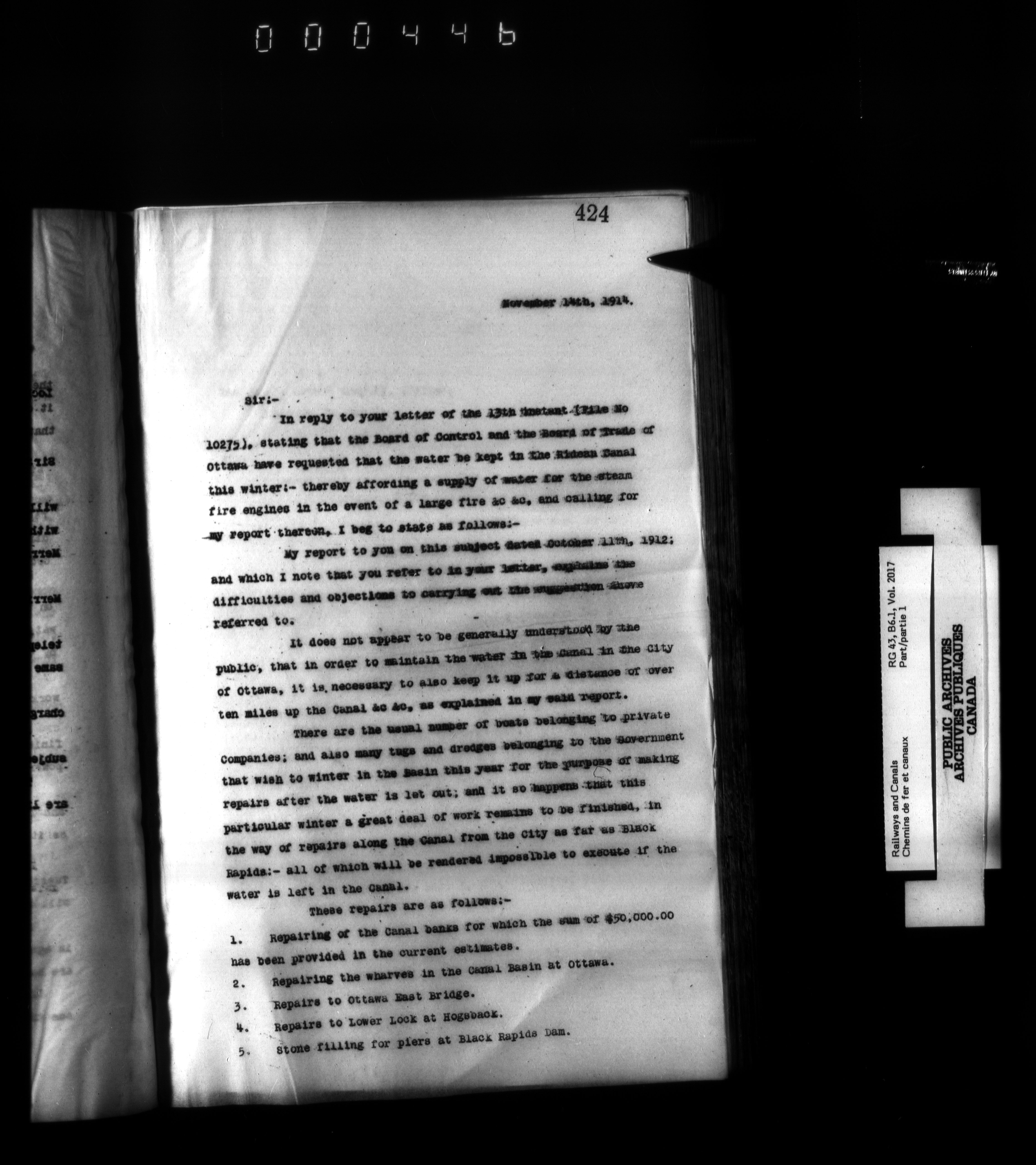 Department of Railways and Canals, Superintending Engineer of the Rideau Canal : Letterbooks : T-2482