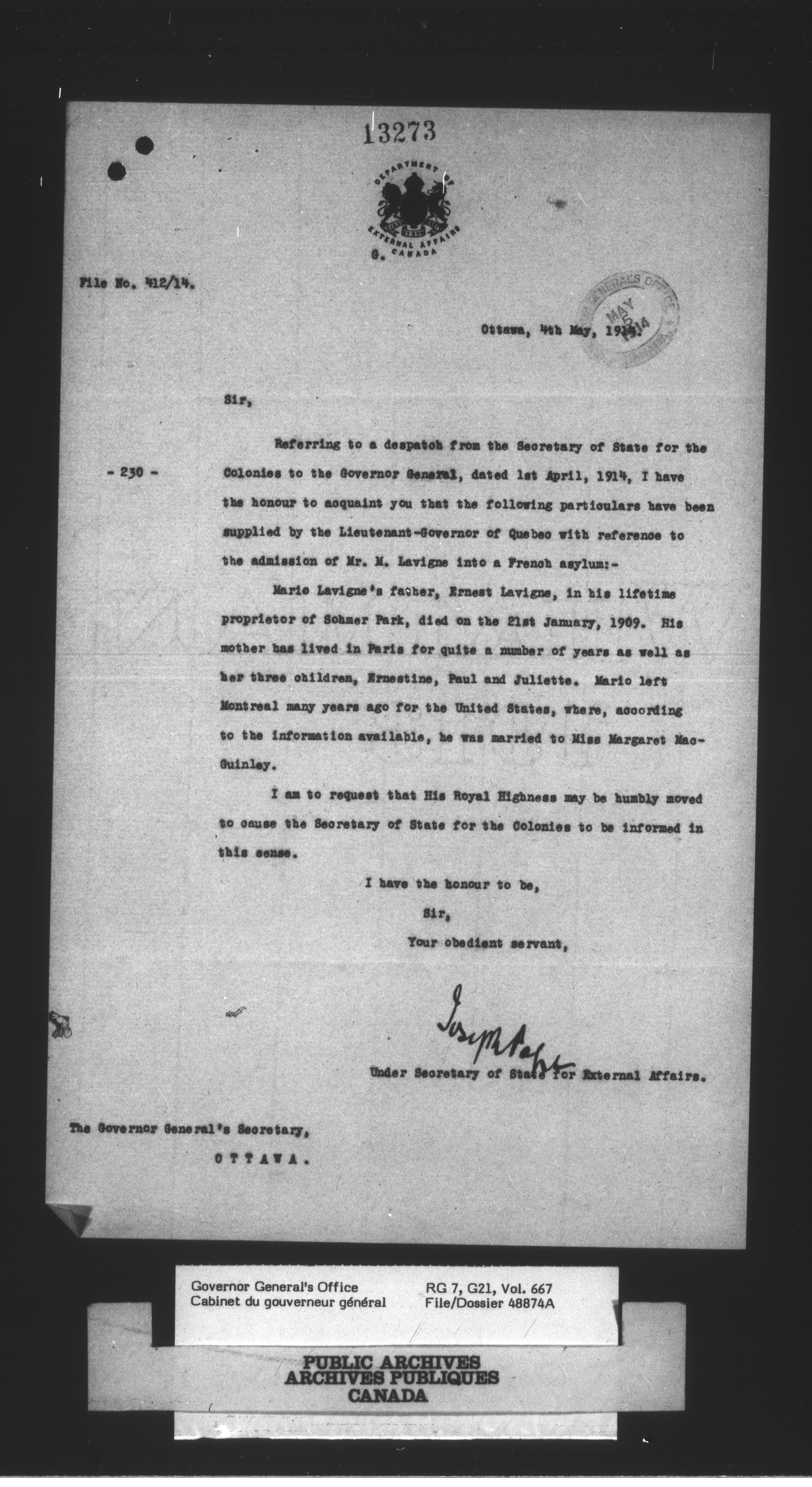 Vol. 667, file 48874-669, file 54713, 1a