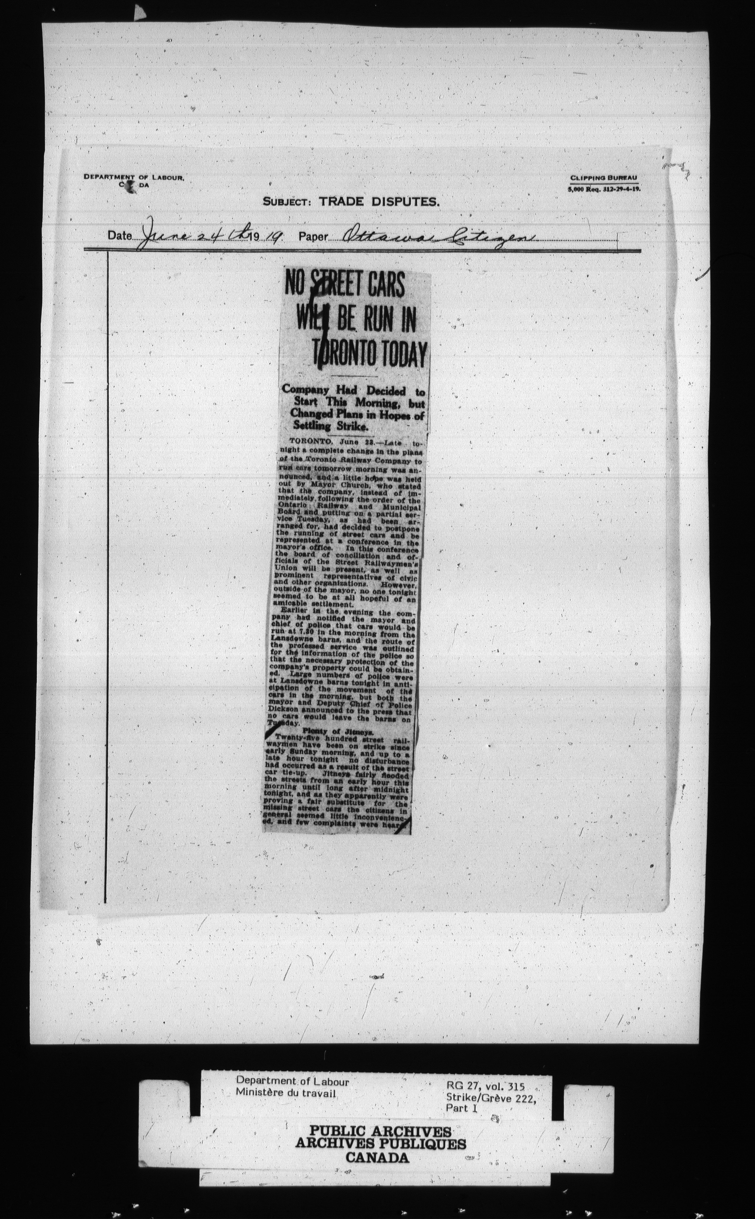 Department of Labour, Economics and Research Branch : Strikes and lockout files - 2701