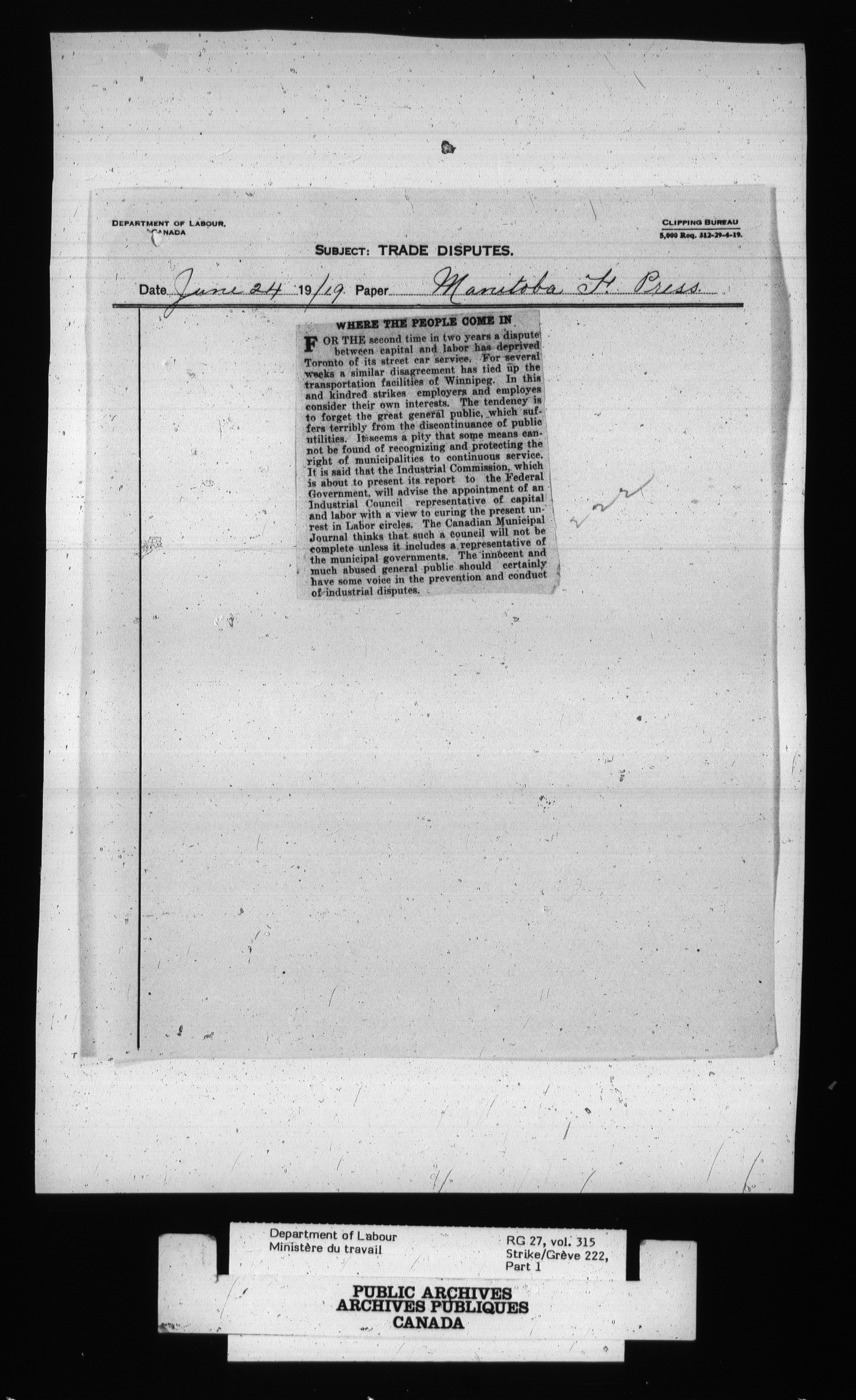 Department of Labour, Economics and Research Branch : Strikes and lockout files - 2701